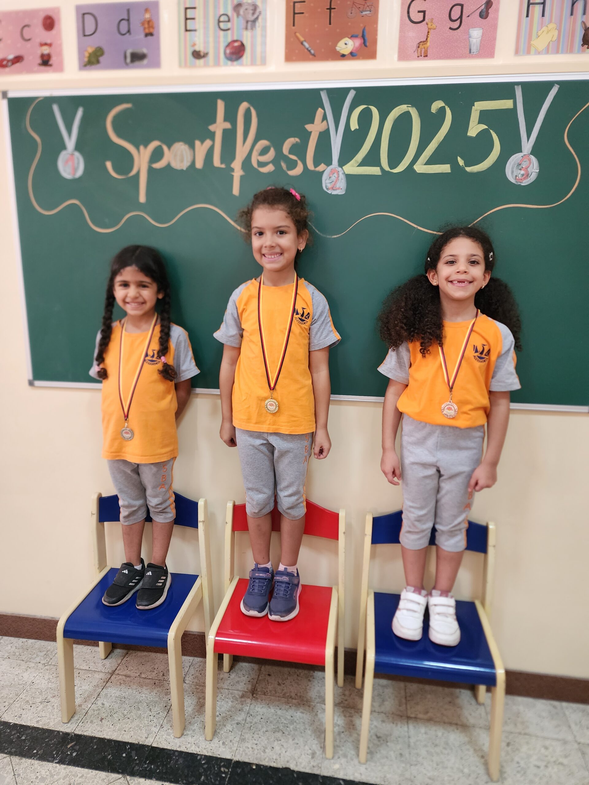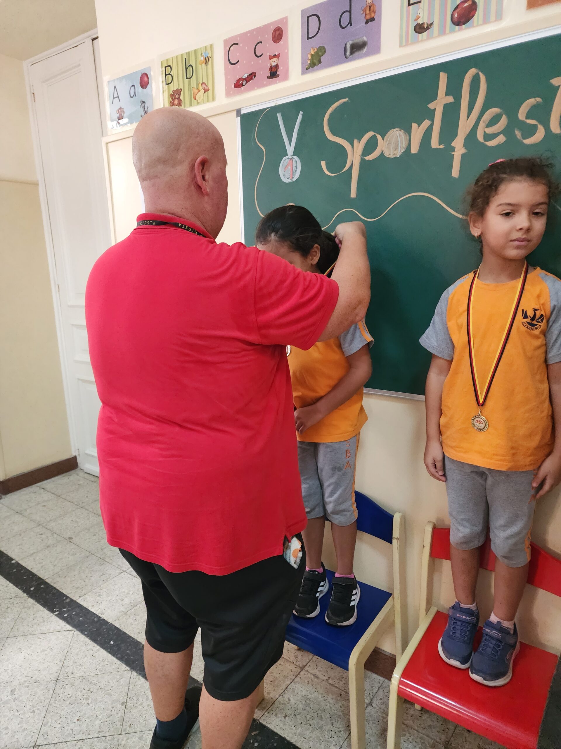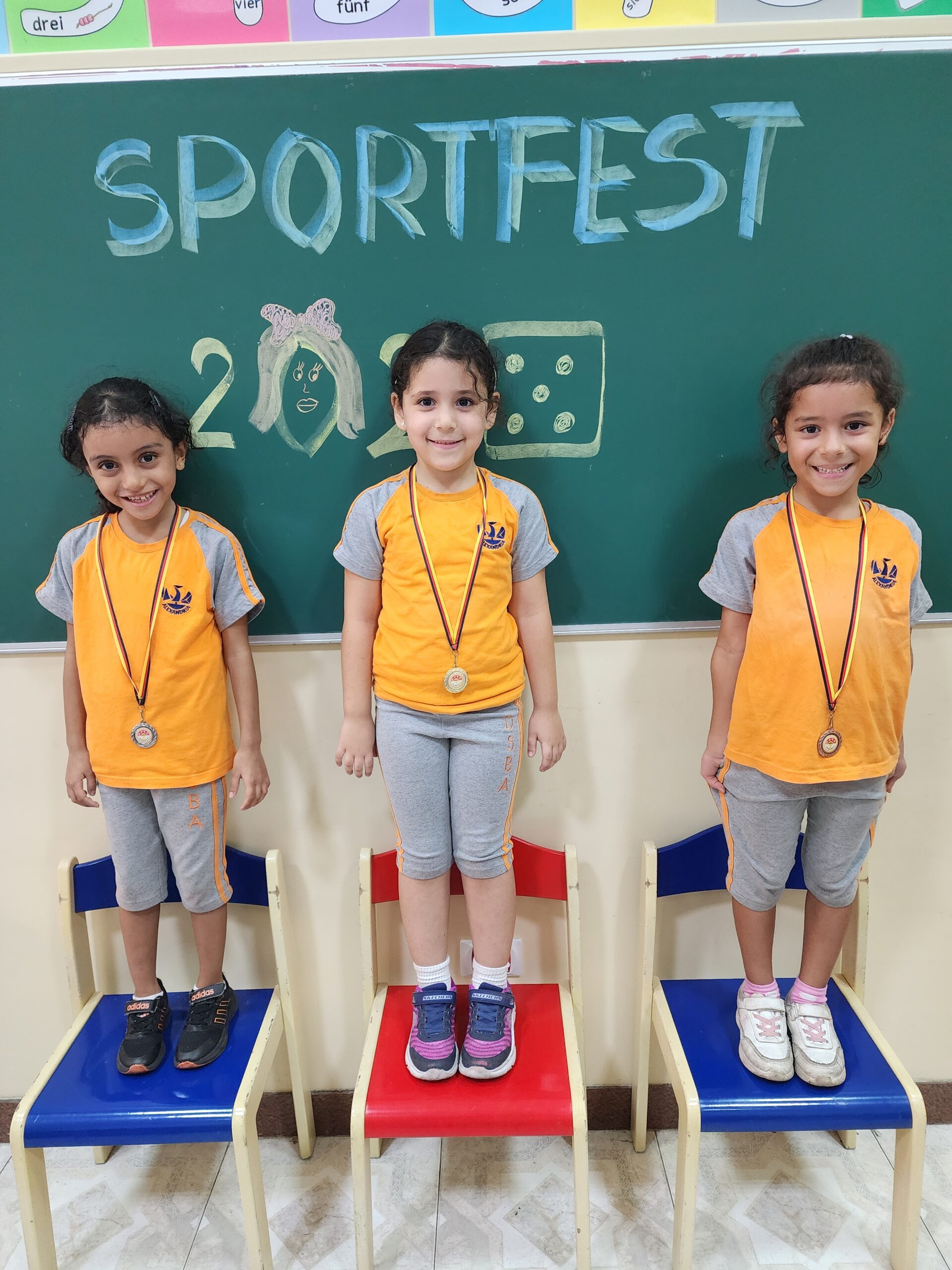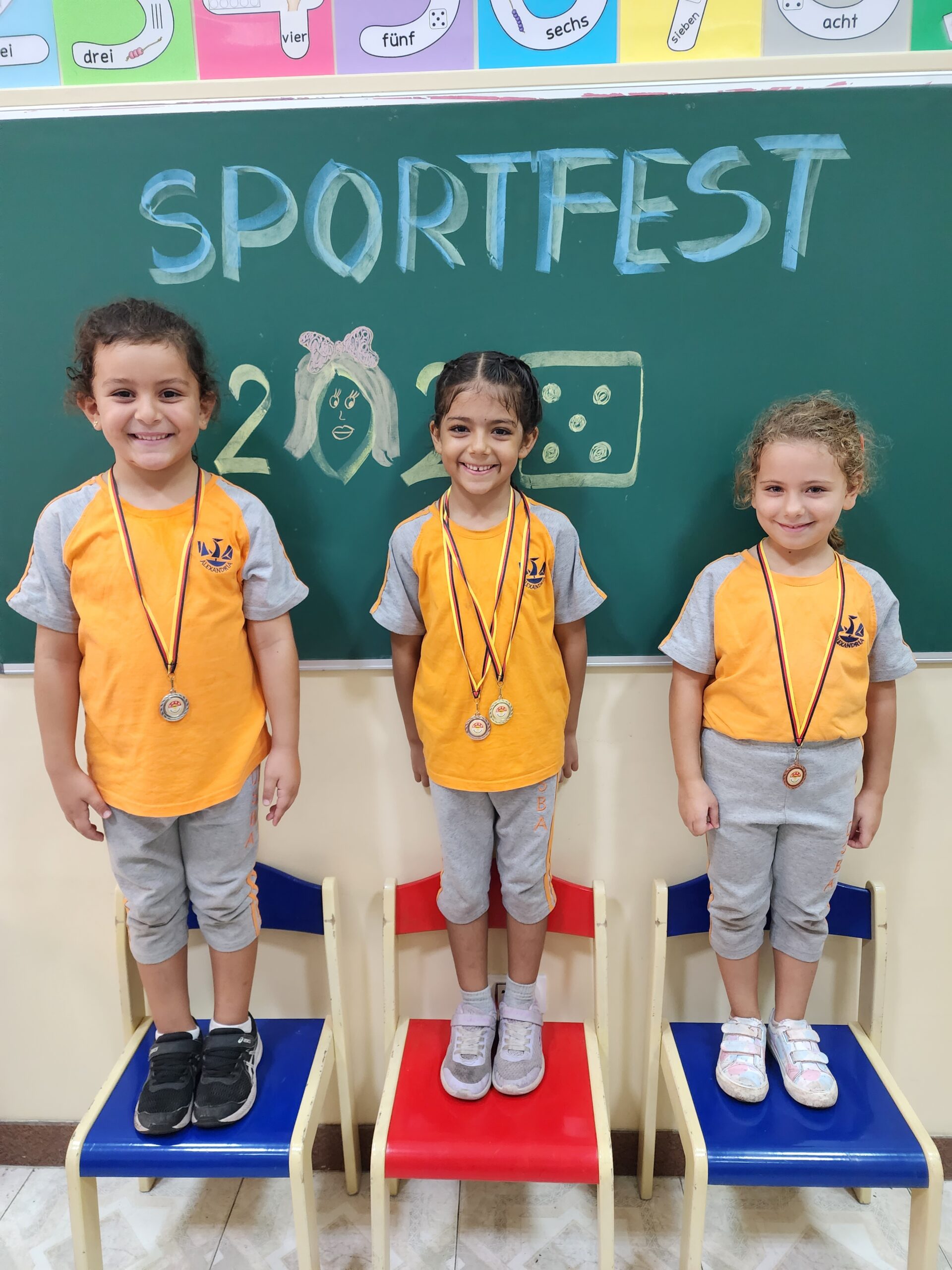 Die drei Stunden vergingen wie im Fluge und wir mussten wieder zurückfahren. Körperlich ausgepowert und glücklich kamen alle an der Schule an und freuten sich auf die Siegerehrung. Diesmal gab es einen wahren „Medaillenregen“, denn es wurden in jeder Gruppe die besten drei Schülerinnen im Laufen, Springen und Werfen mit einer Gold -, Silber und einer Bronzemedaille durch Herrn Eszlinger und Tariq geehrt. Darüber haben sich die Schülerinnen und die Erzieherinnen der Gruppe sehr gefreut. Und diejenigen, die diesmal keine Medaille gewonnen hatten, erhielten noch einen kleinen Preis von den Erzieherinnen überreicht.