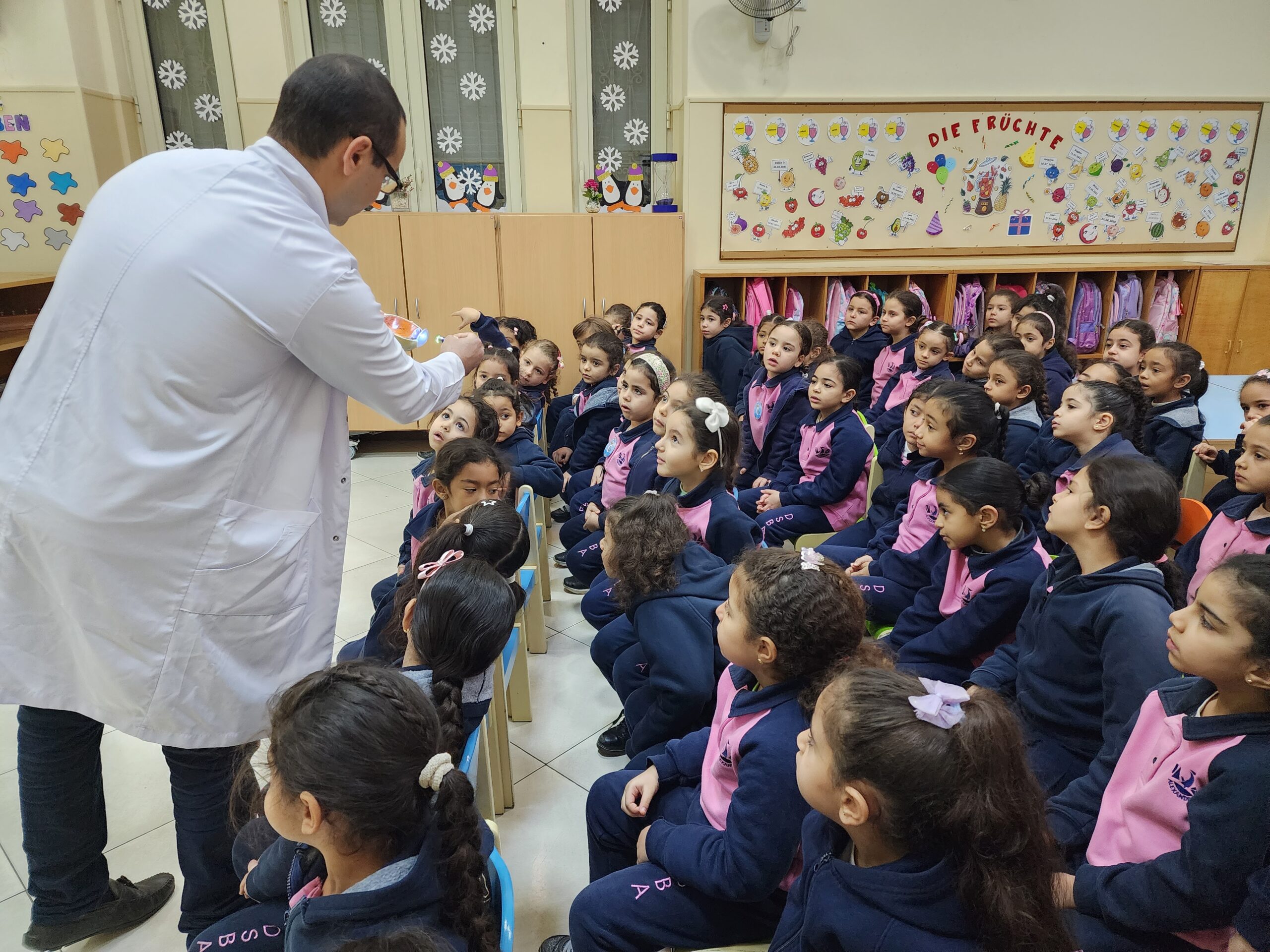 وقد قدّم لصفّي المرحلة التّمهيديّة عرضًا مفصلًا عن طبّ العيون وعن طبيعة عمله اليومي. كما تضمن الجزء التّفاعلي اختبارًا مبسّطًا للنّظر جربته الأطفال بأنفسهن.