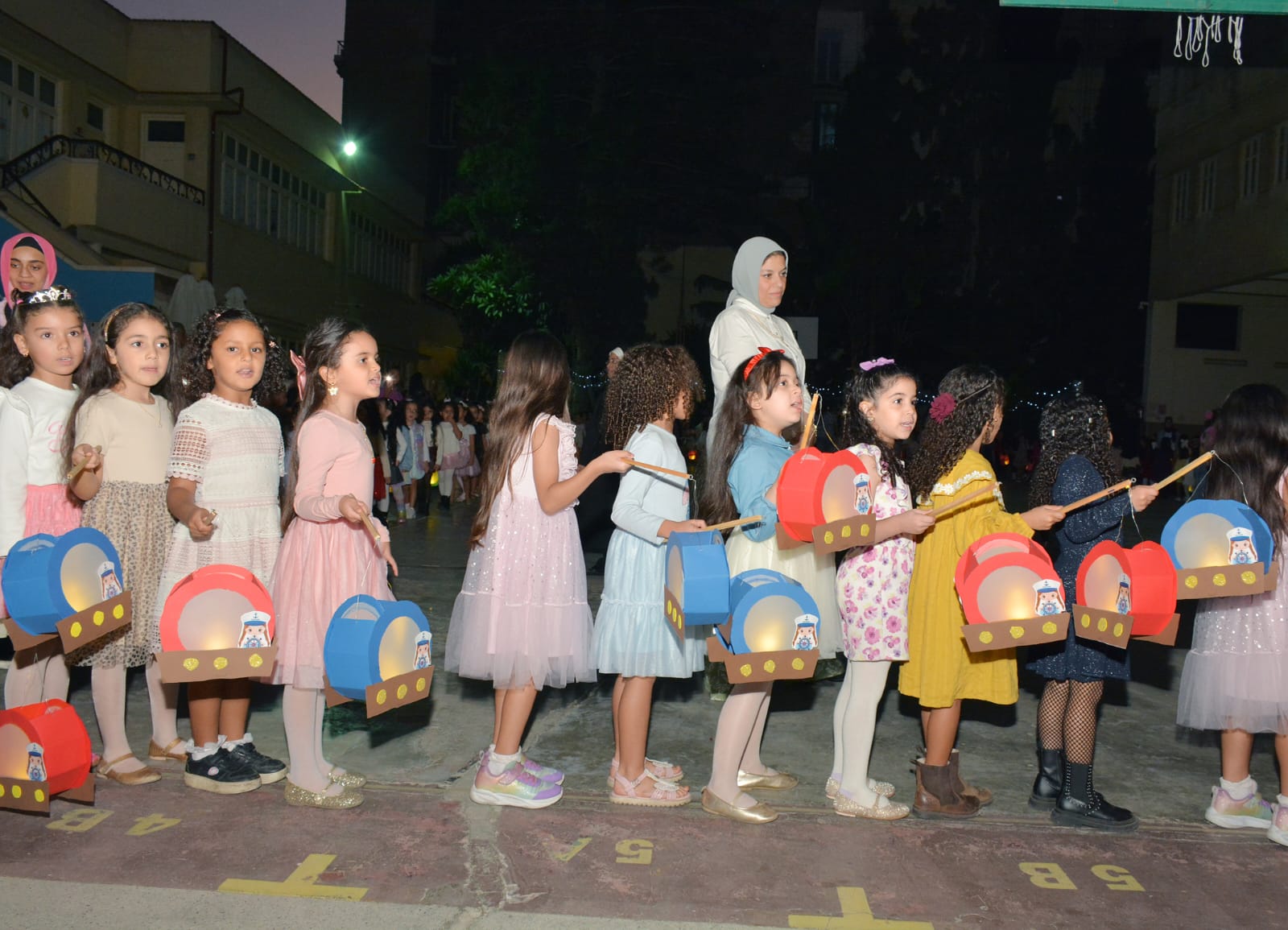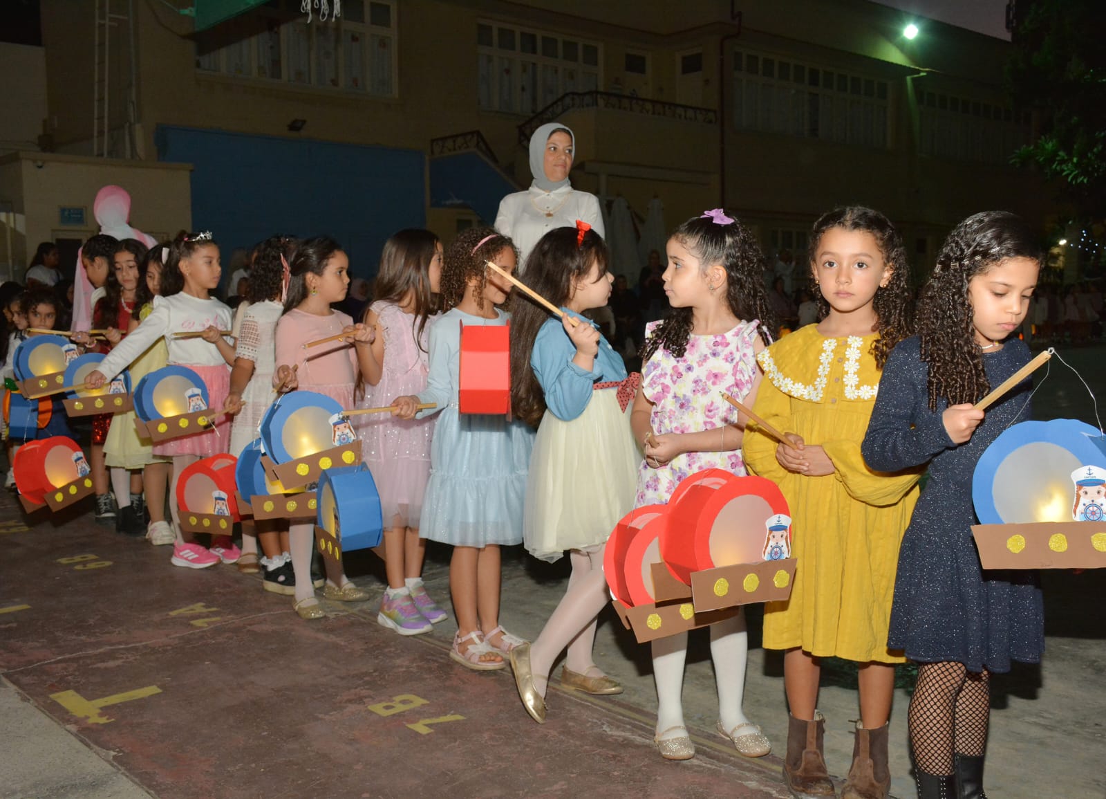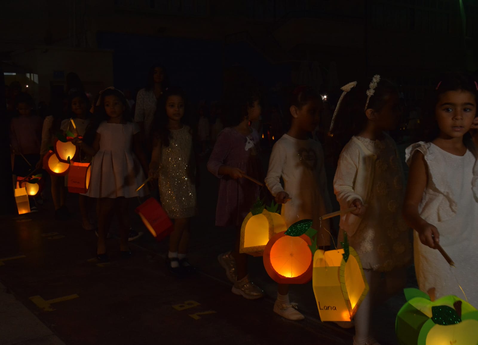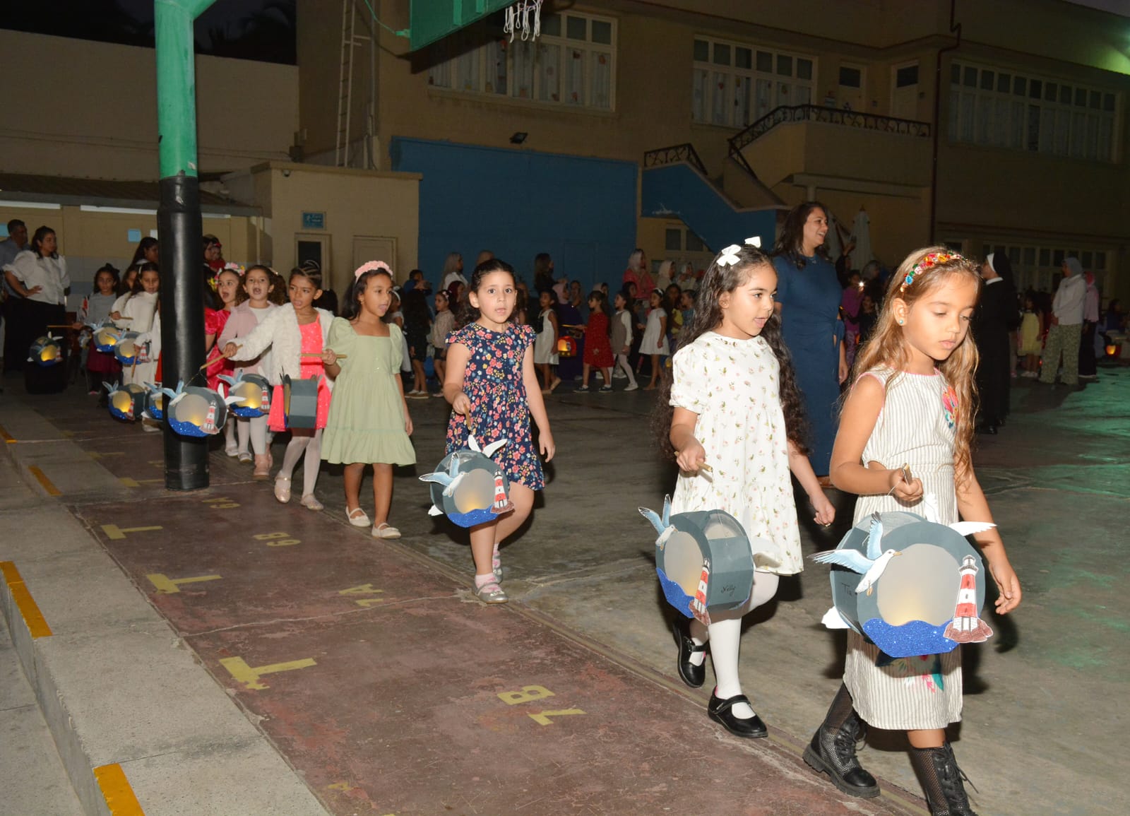 تألقت فوانيس الفاكهة والـكعك (كب كيك) الخاصة بصفّي رياض الأطفال في ظلمة المساء، وتبعهتا فوانيس البحارة والنورس الخاصة بفصلي صف المرحلة التمهيدية.