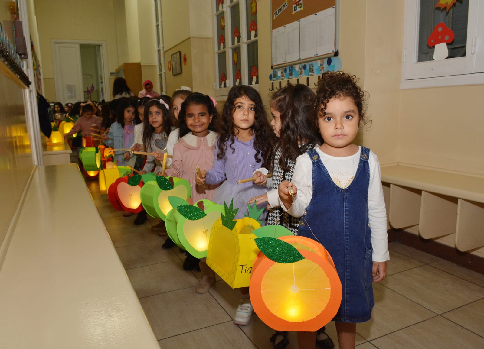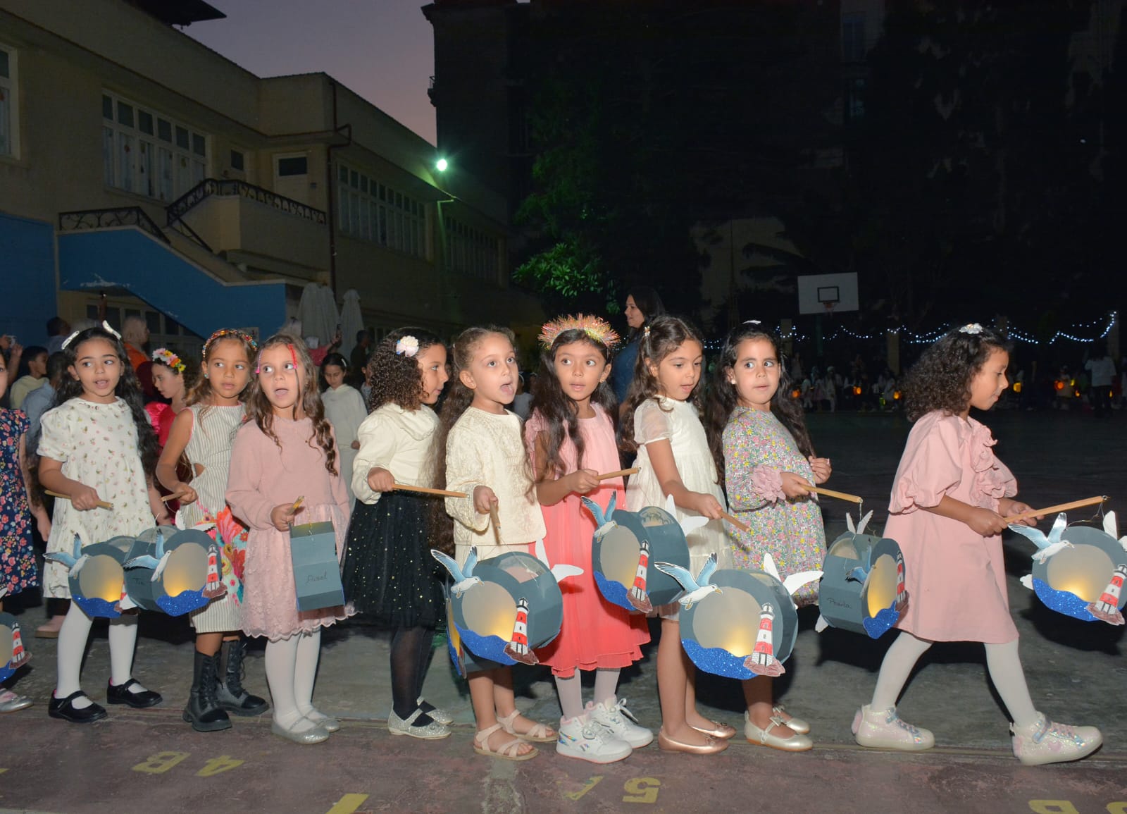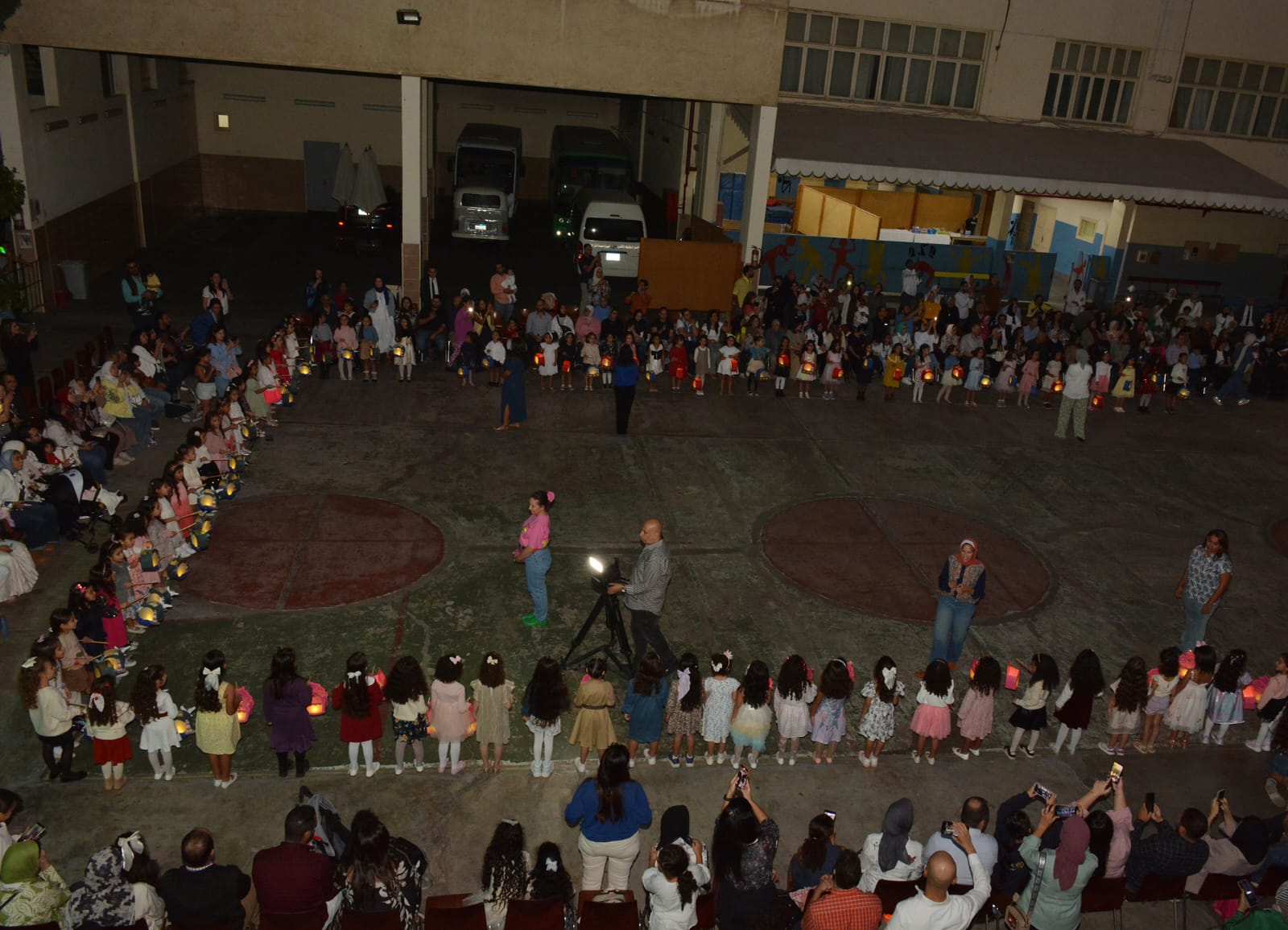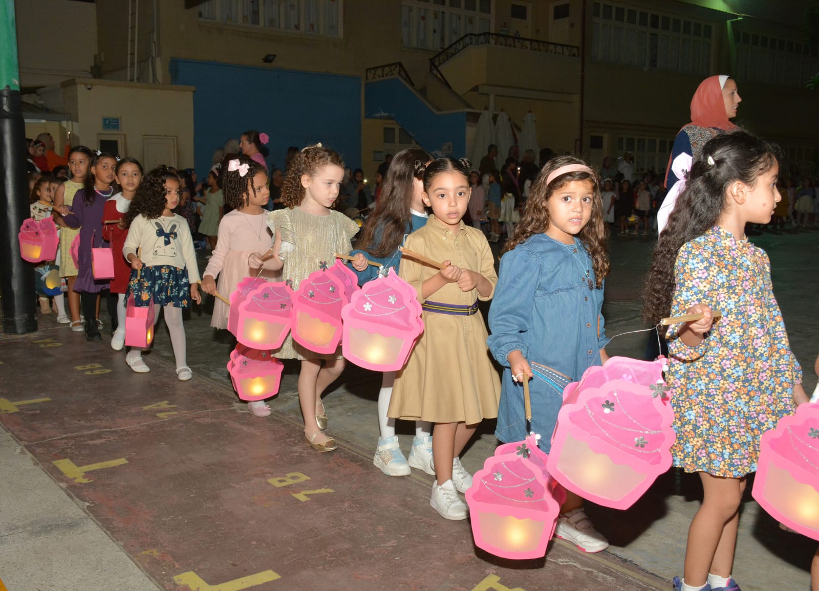 تألقت فوانيس الفاكهة والـكعك (كب كيك) الخاصة بصفّي رياض الأطفال في ظلمة المساء، وتبعهتا فوانيس البحارة والنورس الخاصة بفصلي صف المرحلة التمهيدية.