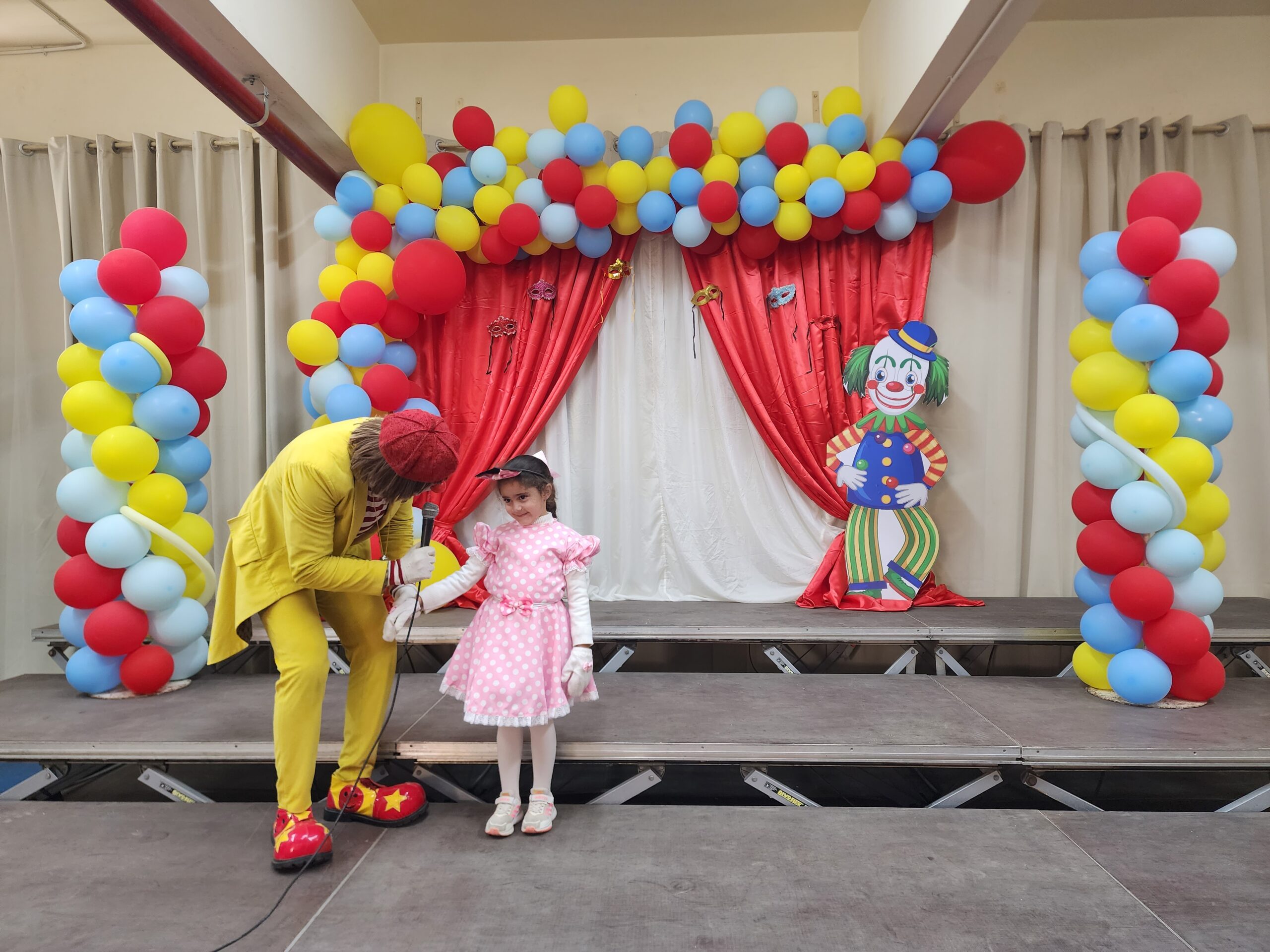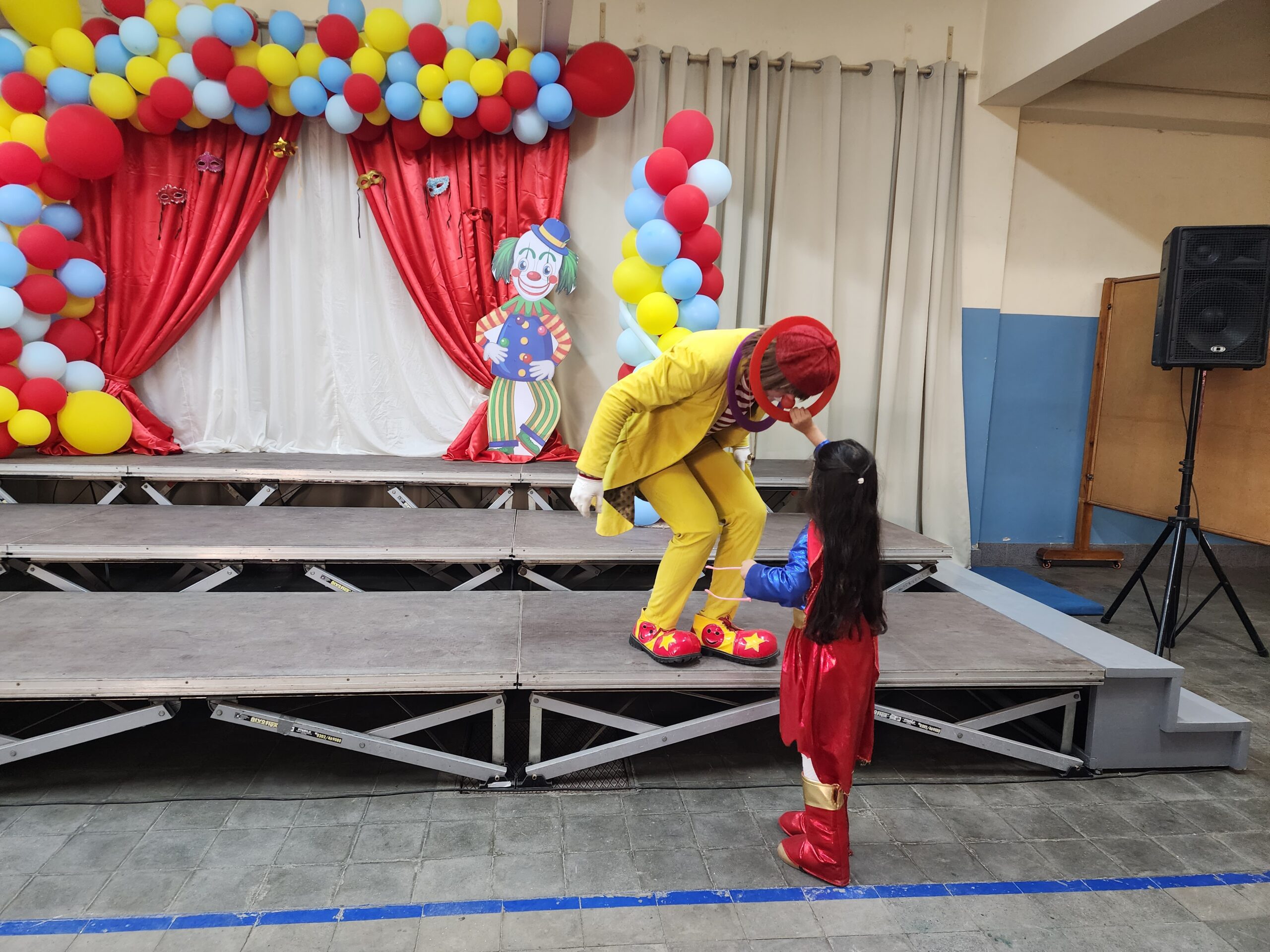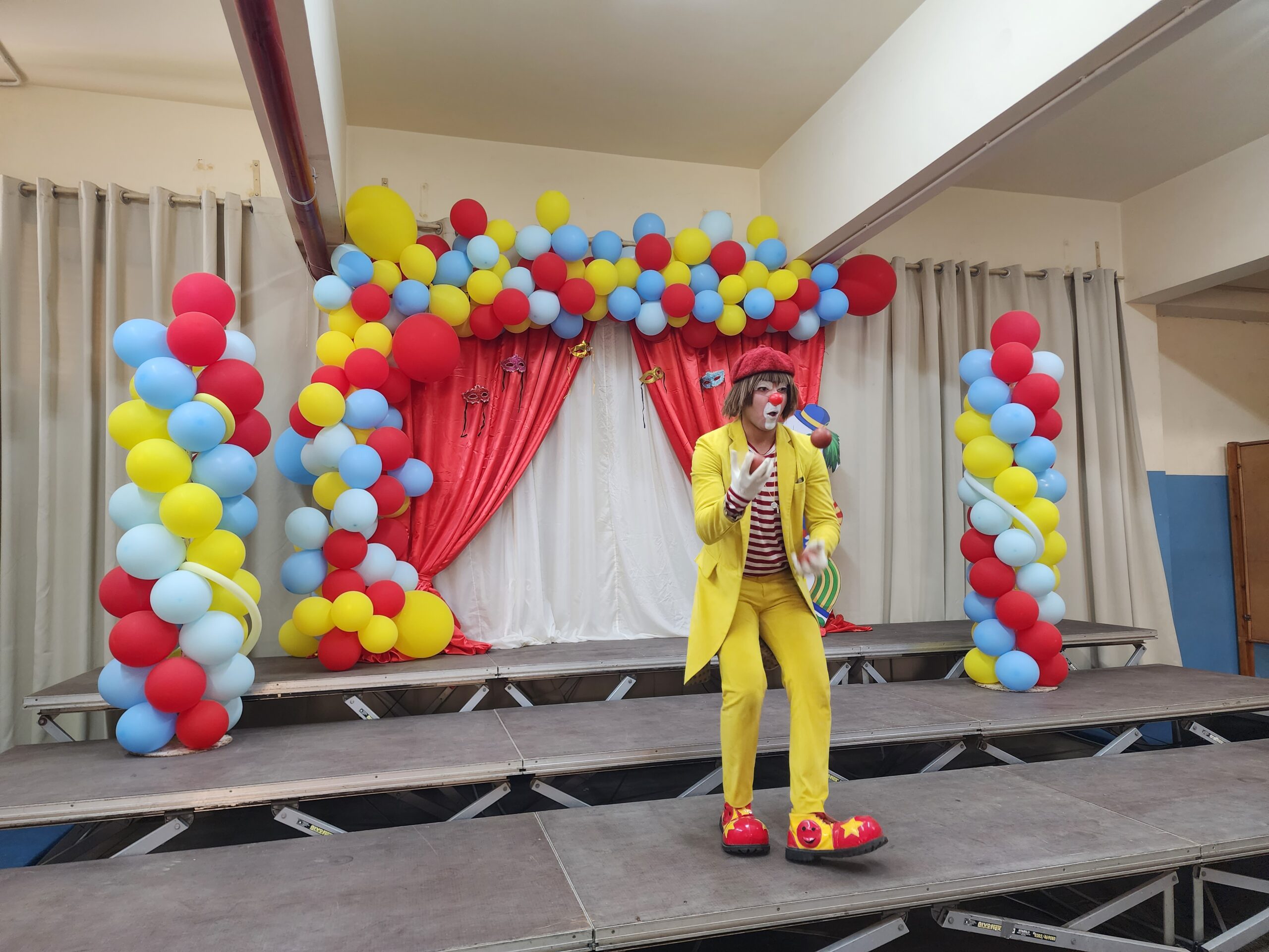 Gesättigt und zufrieden ging es in die festlich geschmückte Turnhalle, wo schon ein schabernacktreibender Clown mit Zaubereien die Kinder in seinen Bann zog.
