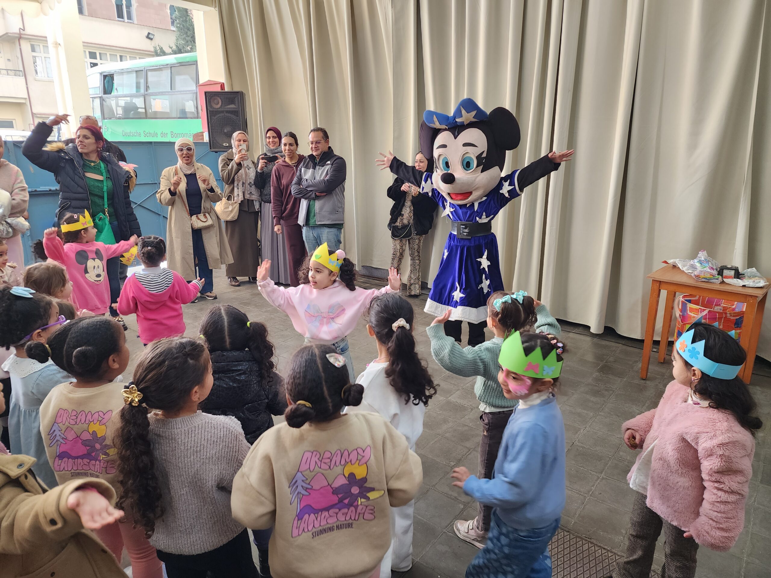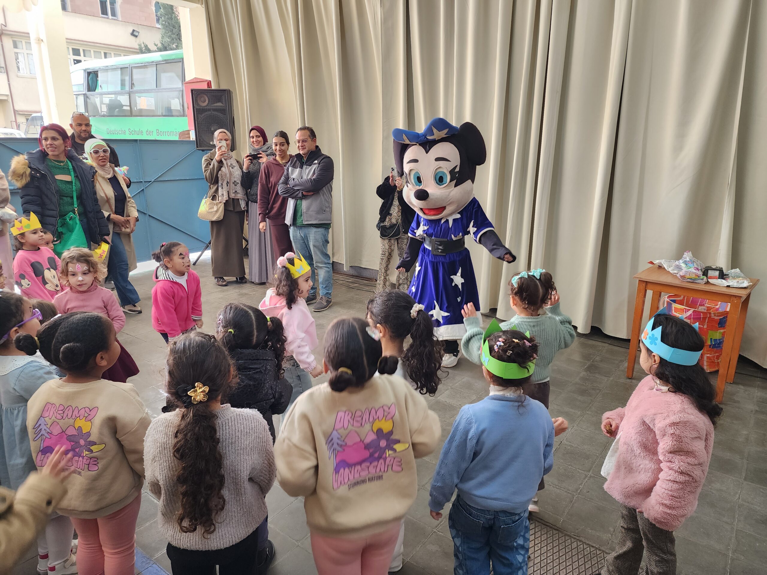 Anschließend wurden in unseren vier Gruppenräumen ansprechende Angebote durchgeführt um den Kleinen eine schöne Zeit zu bescheren und sie für die bevorstehenden Aufnahmetesttage aufzulockern. Die Mädchen durften bunte Kronen kreieren, Armbänder fädeln und die Spielecken erkunden. Die bunte Gesichtsbemalung war natürlich der absolute Hit! Aber da ertönte auch schon laut die Musik in der schnell zur Tanzfläche umfunktionierten Turnhalle, denn niemand anderes als eine menschengroße Minnie-Maus spornte die Besucher an sich den Rhythmen der Partymusik hinzugeben. Ein Kollege der gemieteten Minnie-Maus kreierte für die Kinder Luftballonfiguren. Sogar ein Nemo-Fisch an der Angel wurde gesichtet…