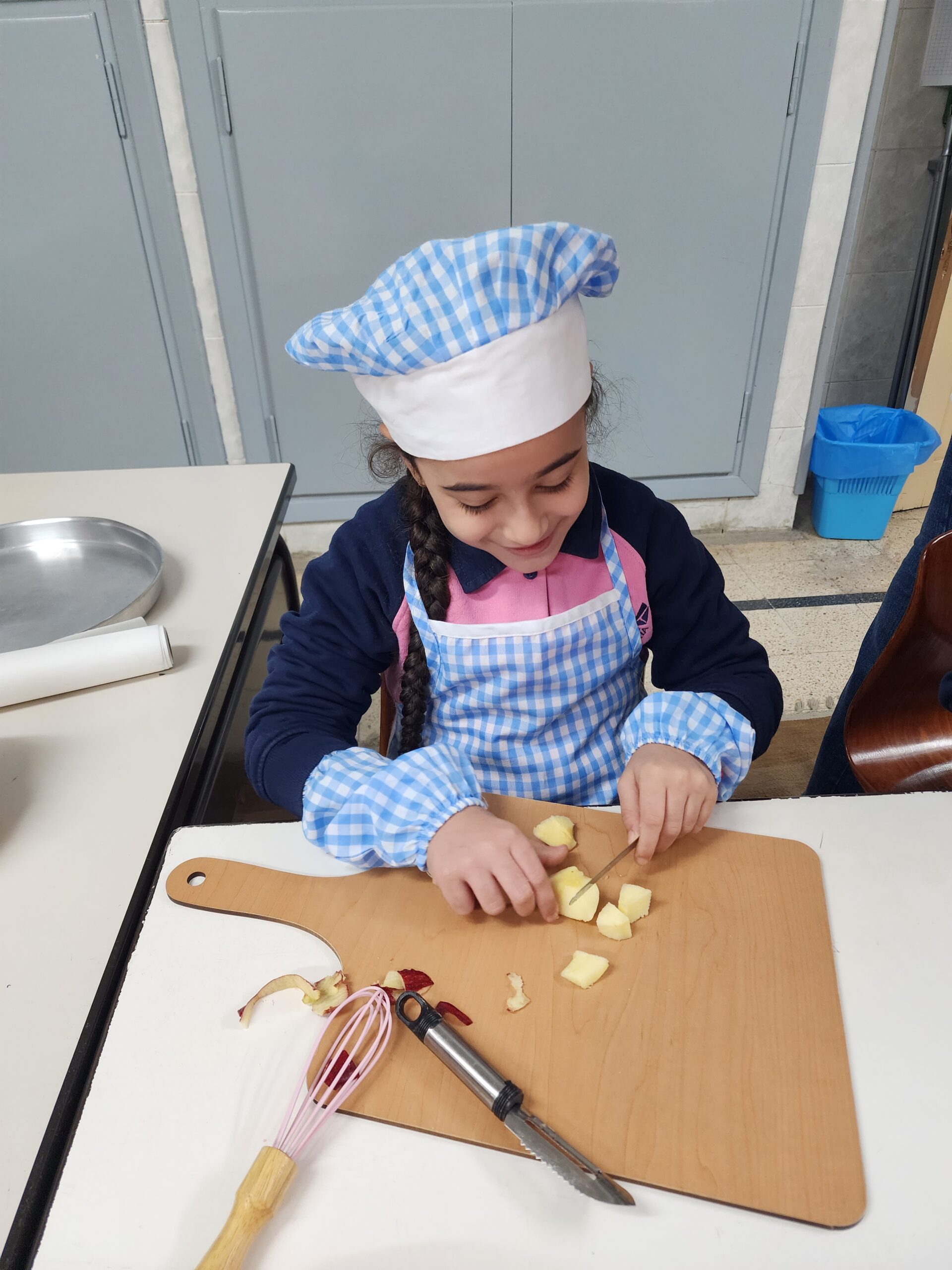 Die Mädchen arbeiteten fleißig in der Küche und begannen zunächst mit der Zubereitung des Desserts. Dafür schnitten sie die Äpfel, mischten alle weiteren Zutaten zusammen und backten den Apfelkuchen im Ofen.