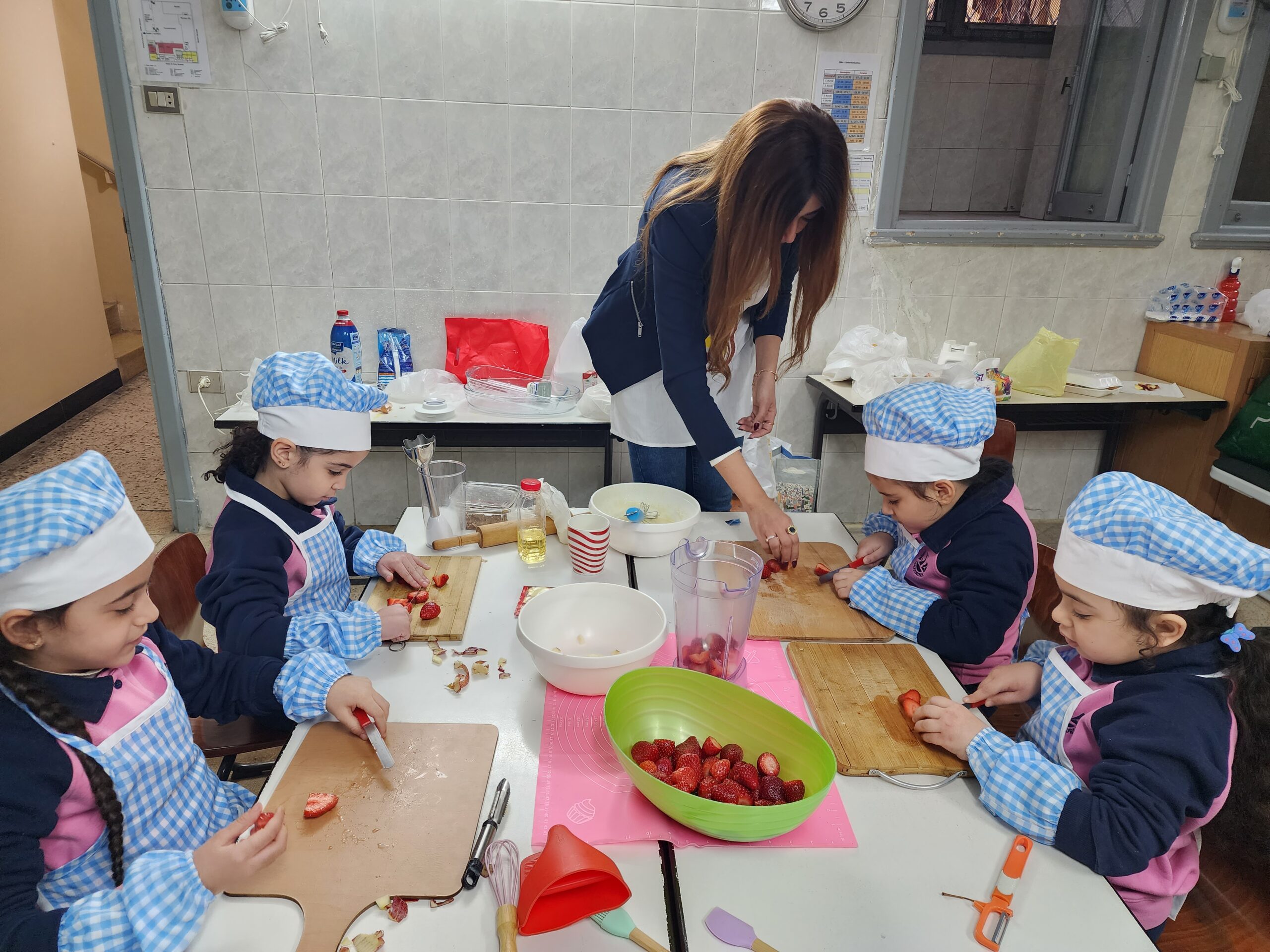 Zum Abschluss bereiteten sie das Getränk zu, indem sie Erdbeeren schnitten und diese mit Zucker und Milch zu einer leckeren Erdbeermilch mixten.