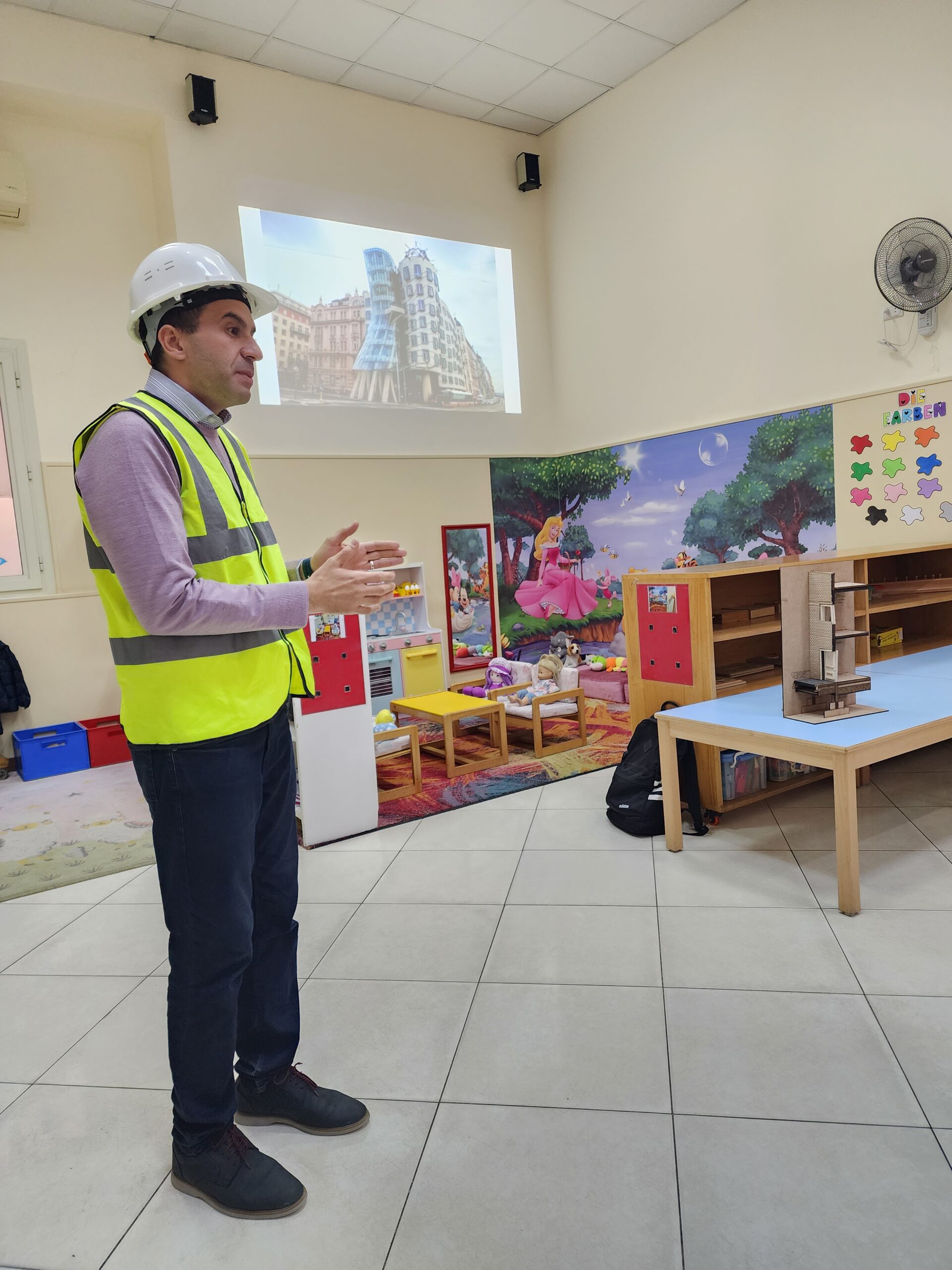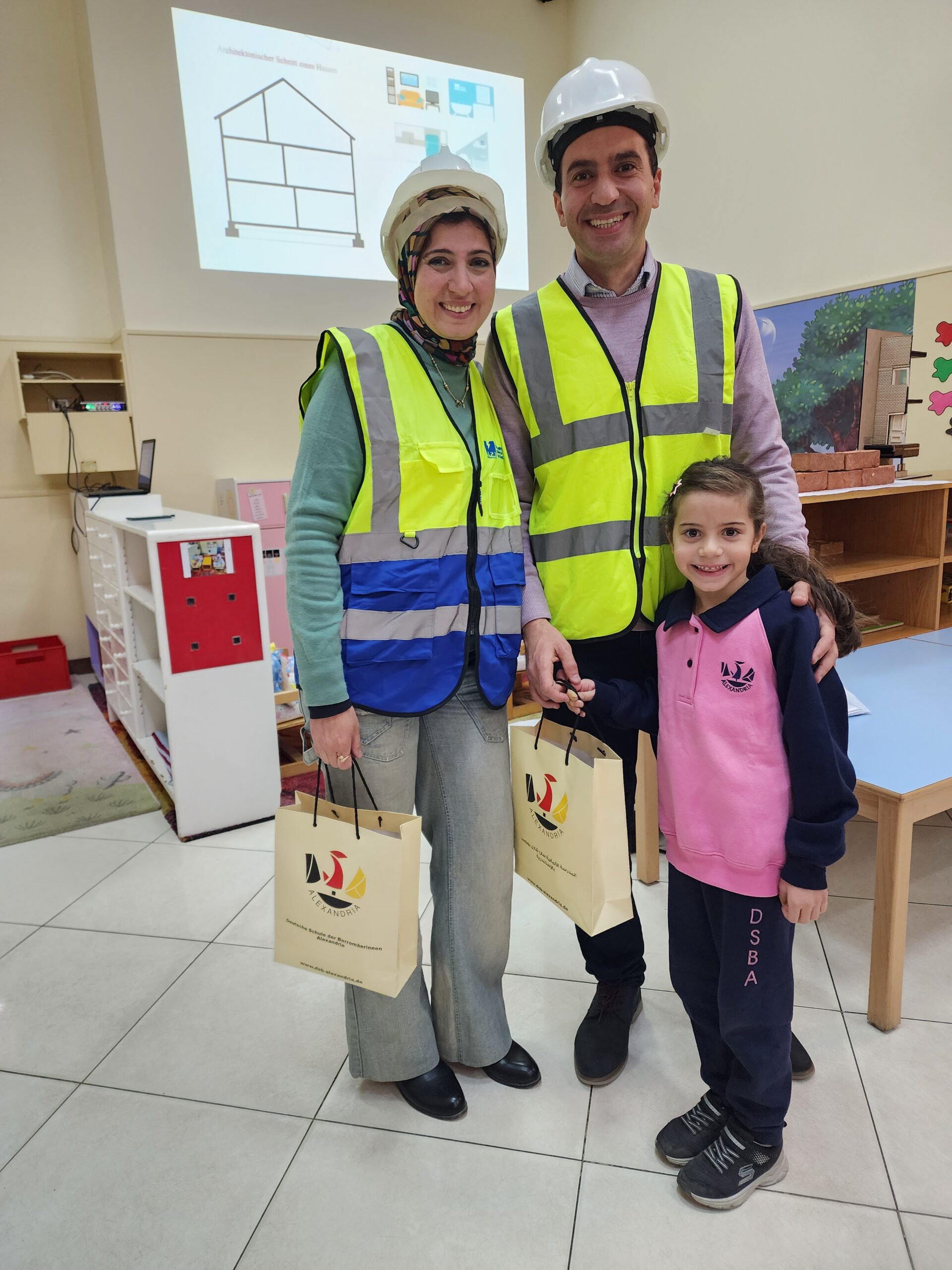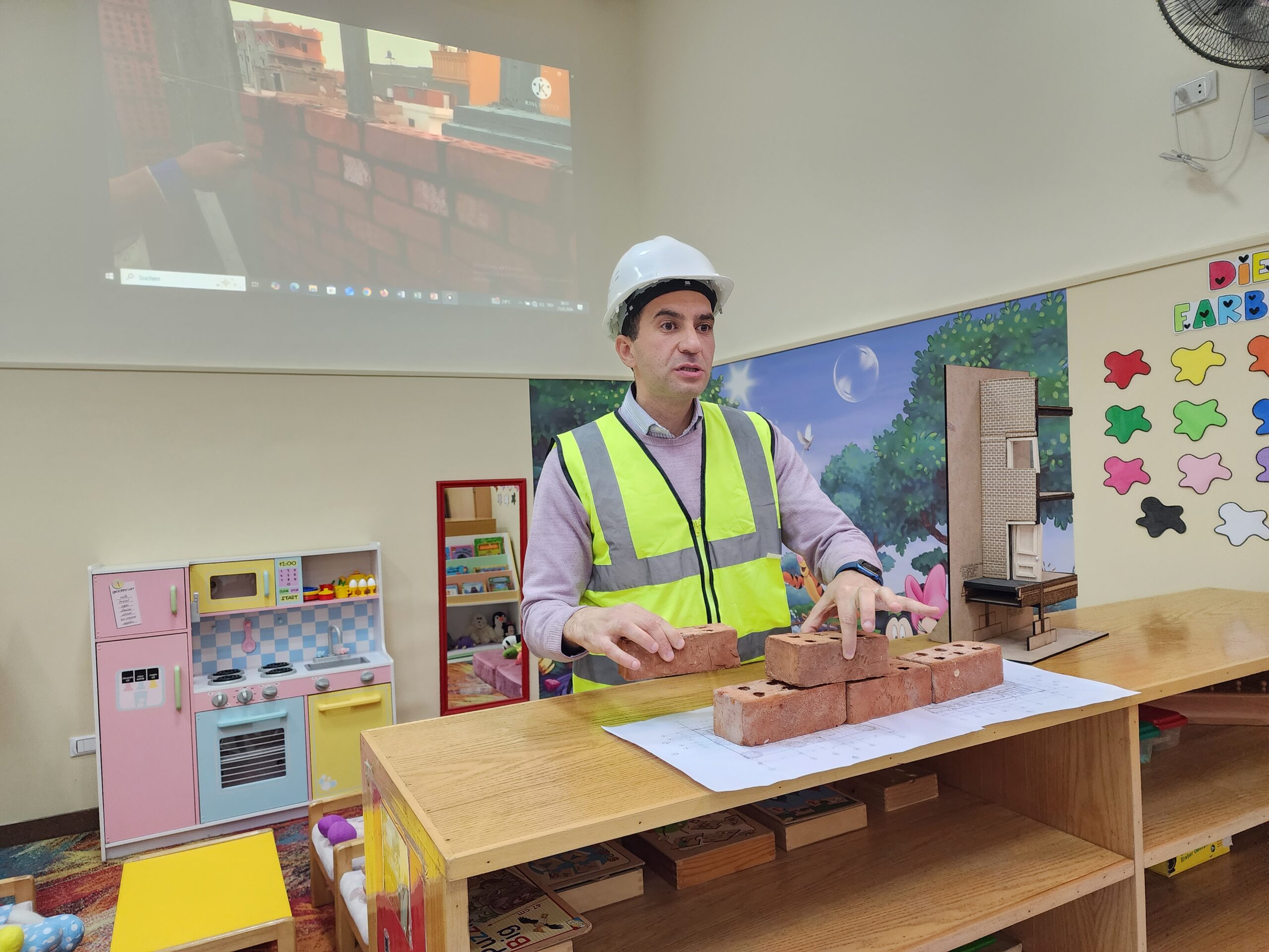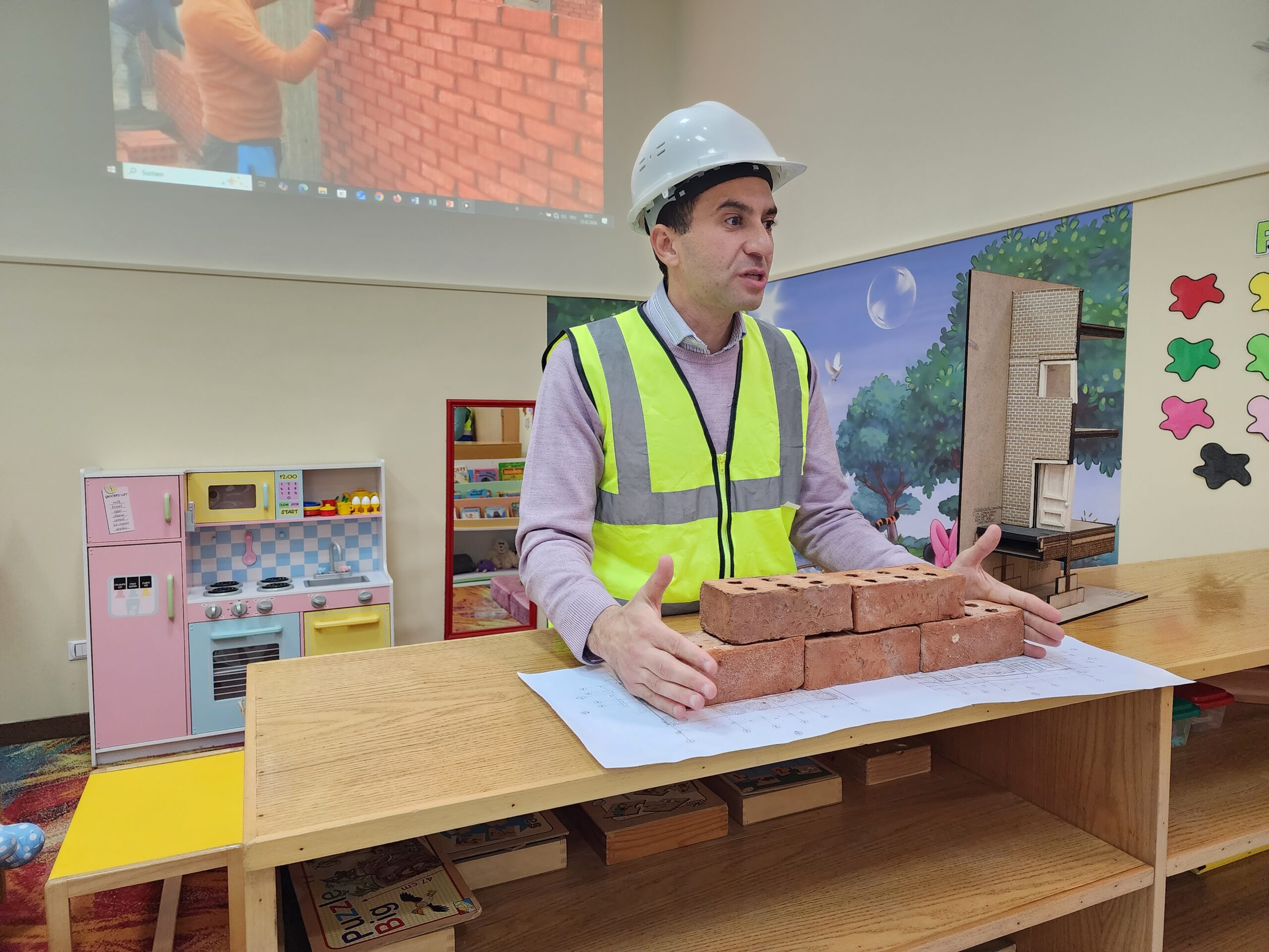 Ingenieur Fahd mit Ehefrau präsentierte den beiden Vorschulklassen seinen Beruf. Gut verbildlicht erklärte er wie Schritt für Schritt ein Gebäude entsteht. Zuerst die Baupläne, sowie die technischen Abläufe der Konstruktion. Hierbei müssen nicht nur Gas- und Stromleitungen geplant und gelegt werden, sondern auch Sanitäranlageninstallationen Hand in Hand mit Handwerkern errichtet werden. Den Kindern wurde auch gut verständlich erklärt, warum das Fundament des Bauwerks und die Säulenkonstruktion maßgeblich zur Stabilität beitragen.