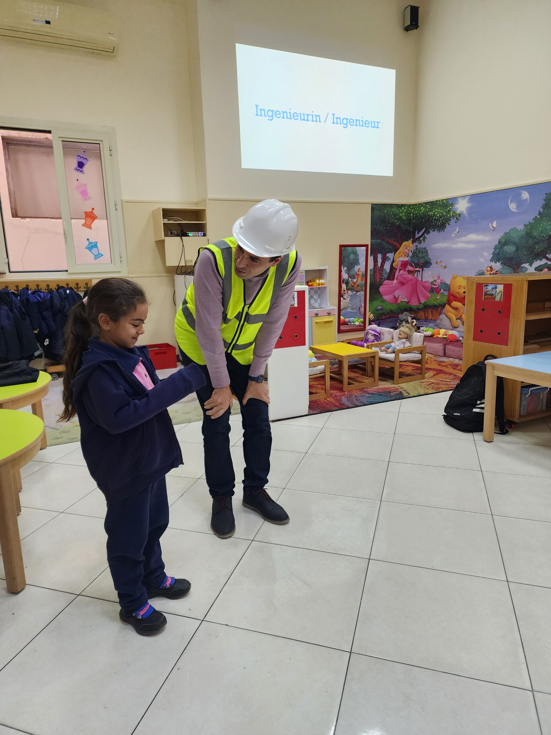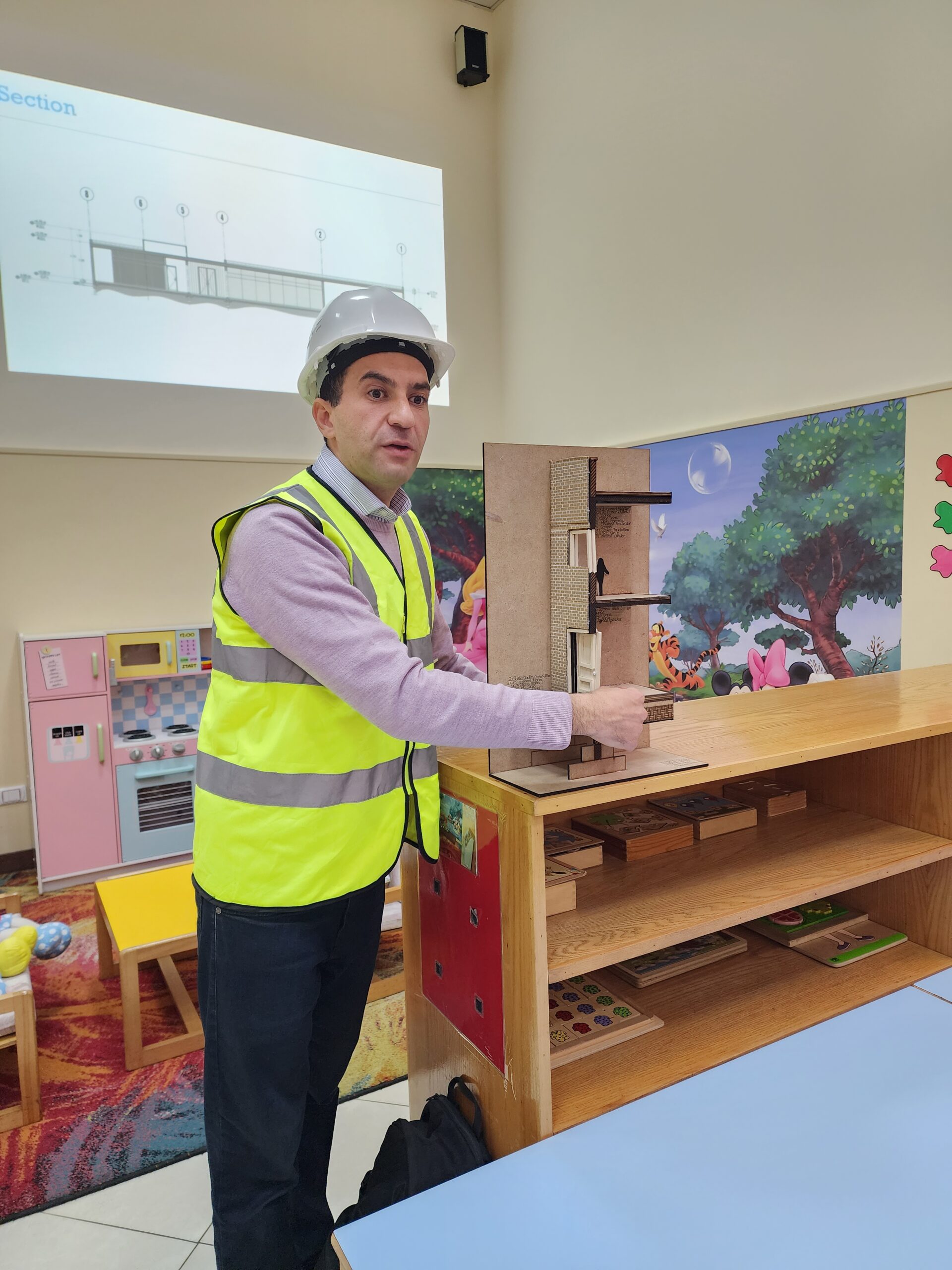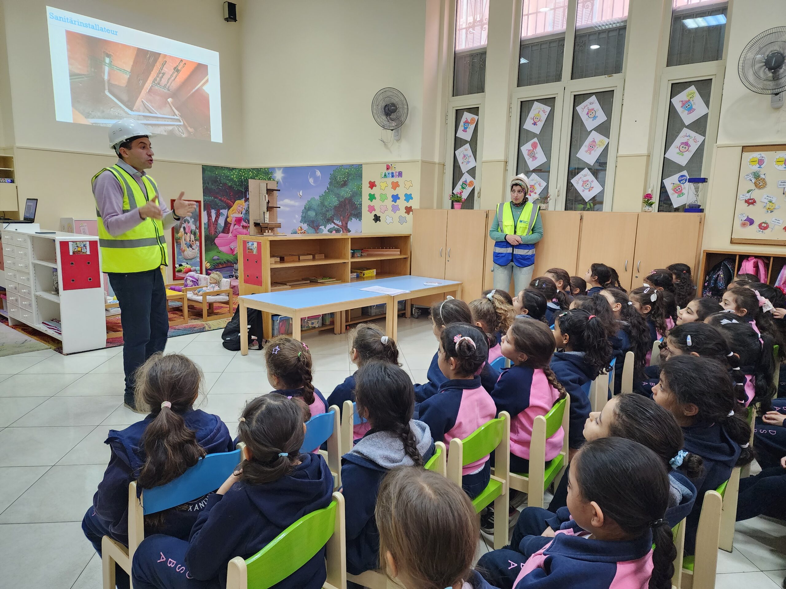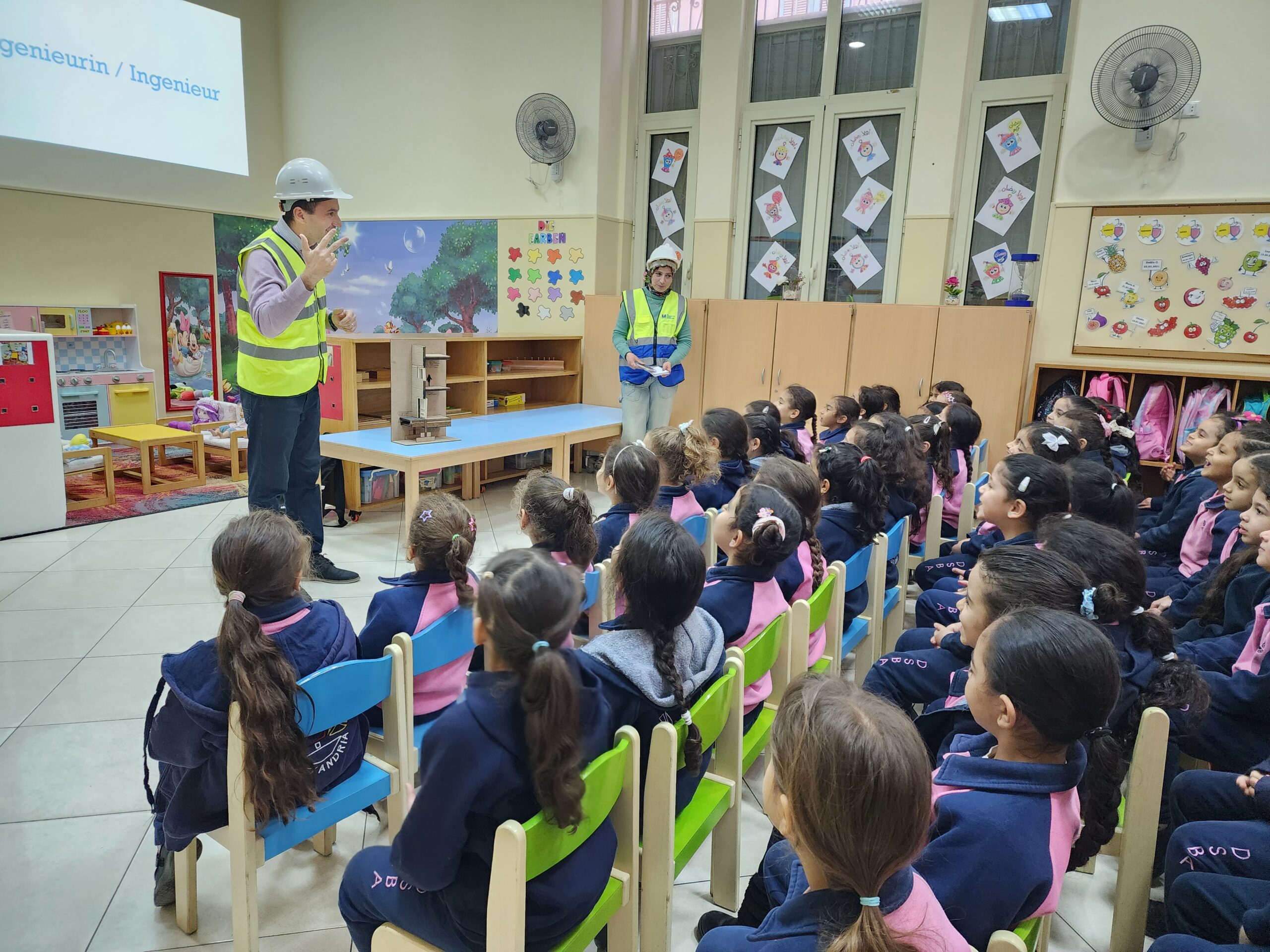 Ingenieur Fahd mit Ehefrau präsentierte den beiden Vorschulklassen seinen Beruf. Gut verbildlicht erklärte er wie Schritt für Schritt ein Gebäude entsteht. Zuerst die Baupläne, sowie die technischen Abläufe der Konstruktion. Hierbei müssen nicht nur Gas- und Stromleitungen geplant und gelegt werden, sondern auch Sanitäranlageninstallationen Hand in Hand mit Handwerkern errichtet werden. Den Kindern wurde auch gut verständlich erklärt, warum das Fundament des Bauwerks und die Säulenkonstruktion maßgeblich zur Stabilität beitragen.
