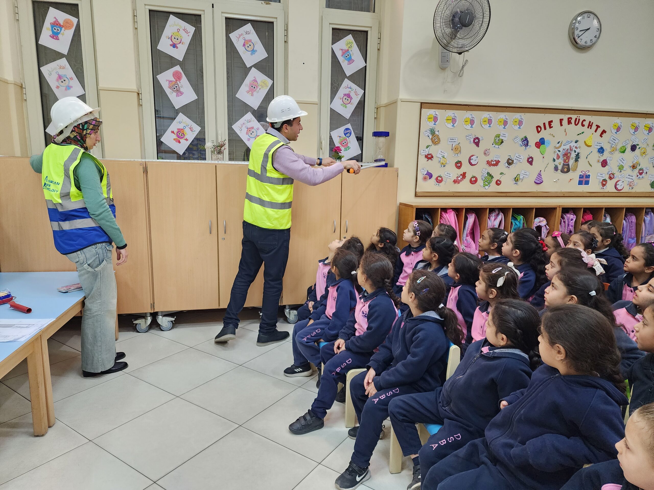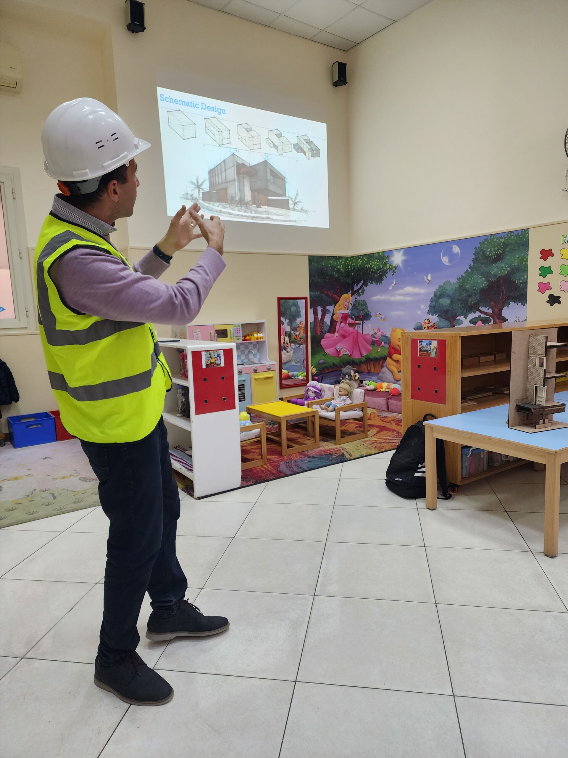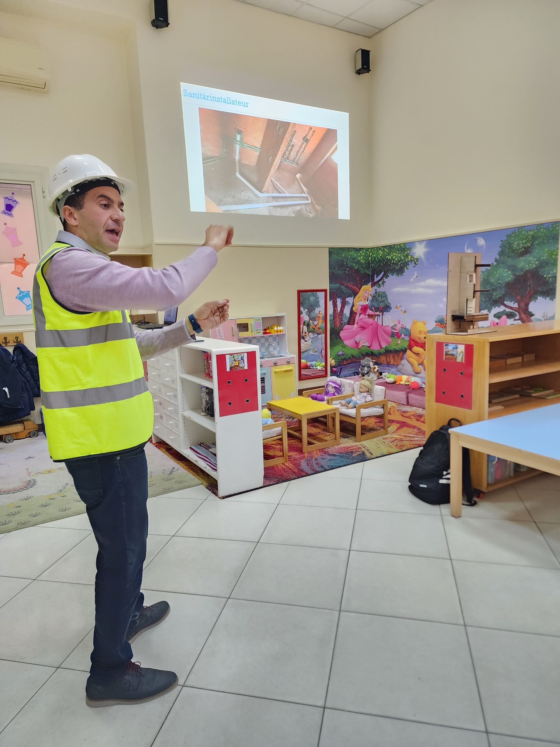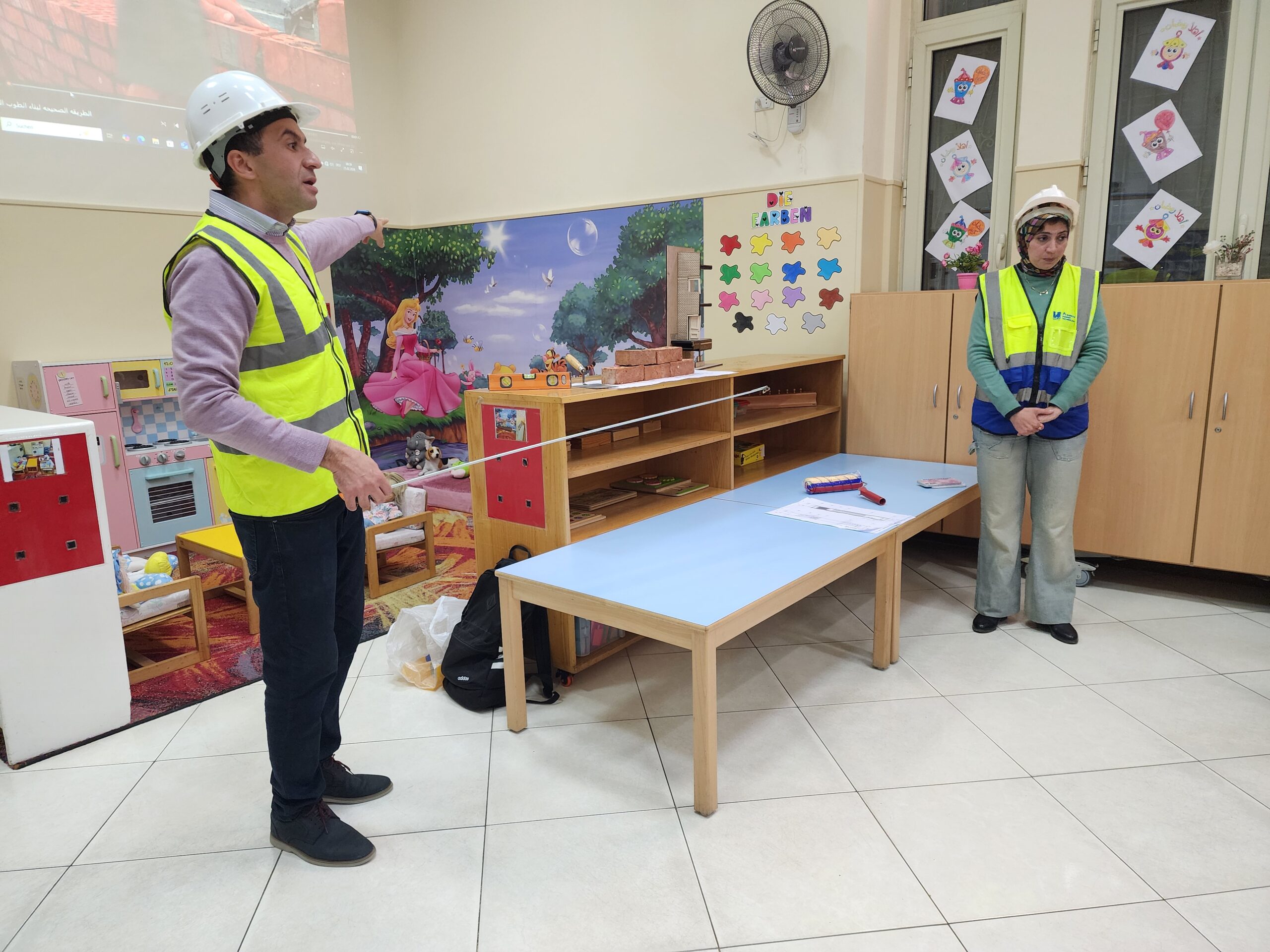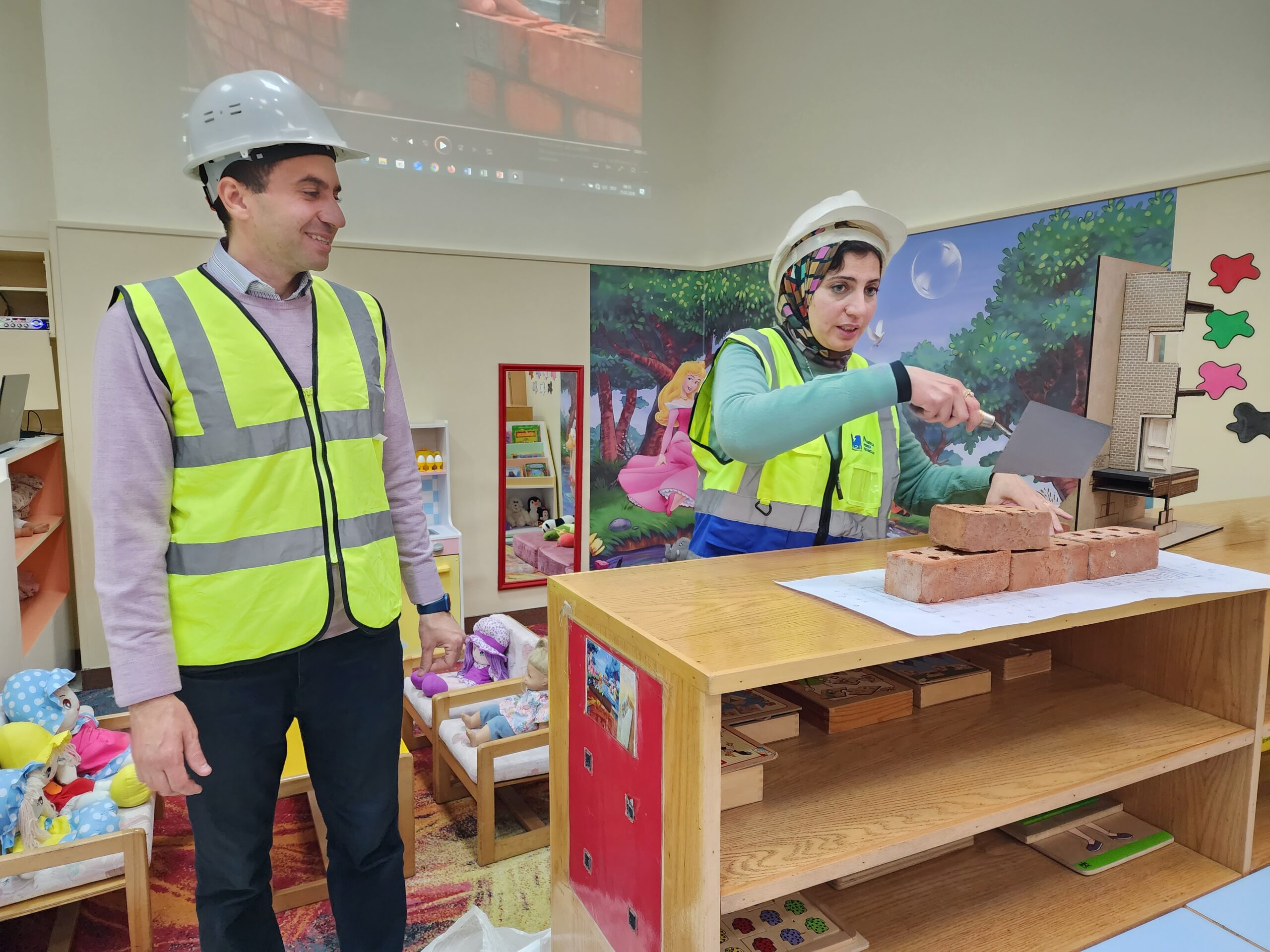 Ingenieur Fahd mit Ehefrau präsentierte den beiden Vorschulklassen seinen Beruf. Gut verbildlicht erklärte er wie Schritt für Schritt ein Gebäude entsteht. Zuerst die Baupläne, sowie die technischen Abläufe der Konstruktion. Hierbei müssen nicht nur Gas- und Stromleitungen geplant und gelegt werden, sondern auch Sanitäranlageninstallationen Hand in Hand mit Handwerkern errichtet werden. Den Kindern wurde auch gut verständlich erklärt, warum das Fundament des Bauwerks und die Säulenkonstruktion maßgeblich zur Stabilität beitragen.
