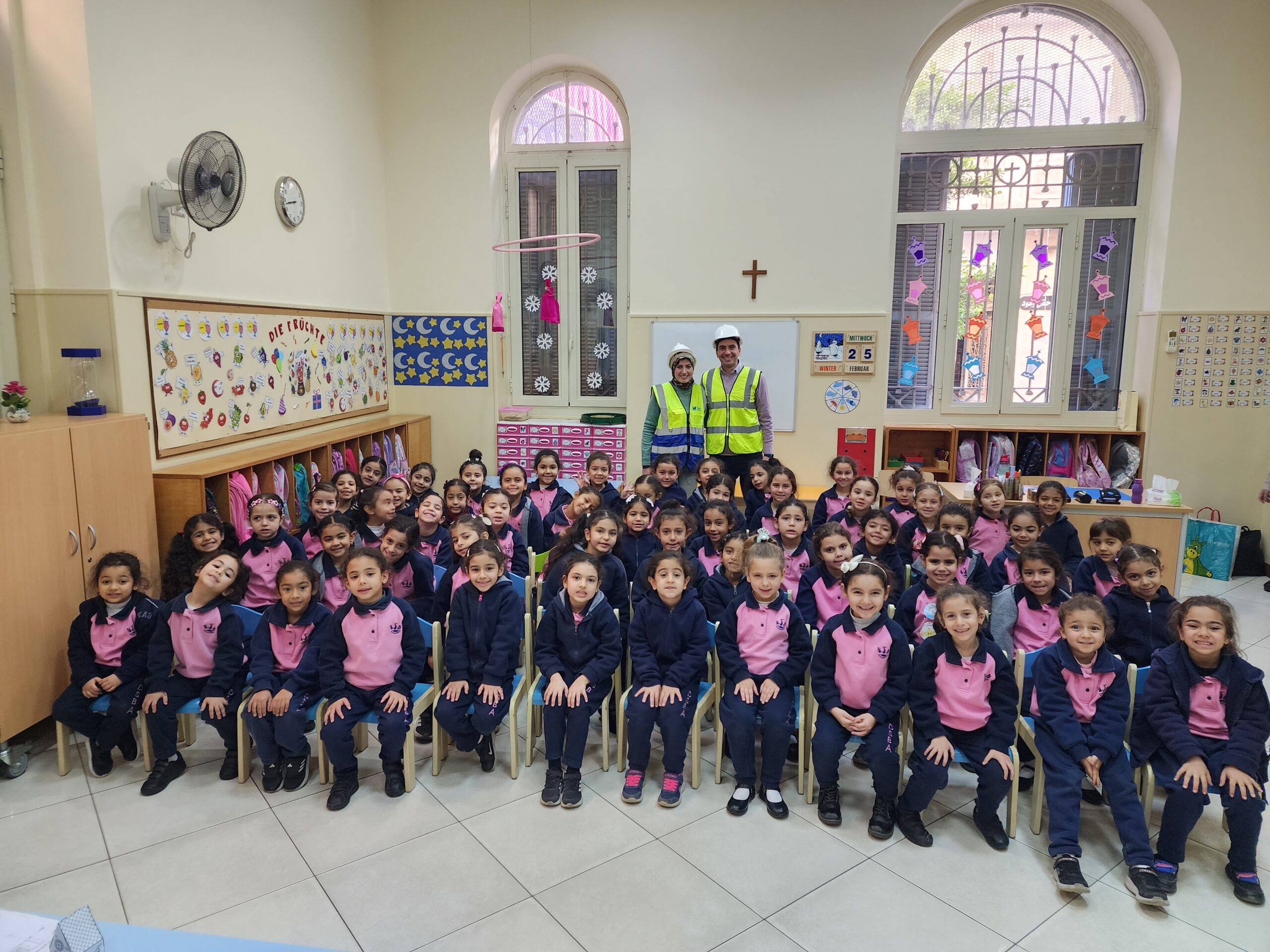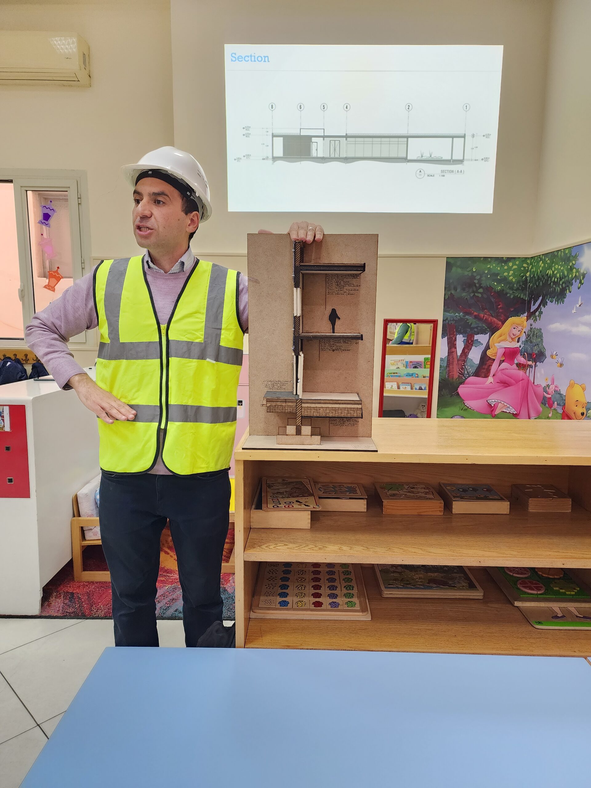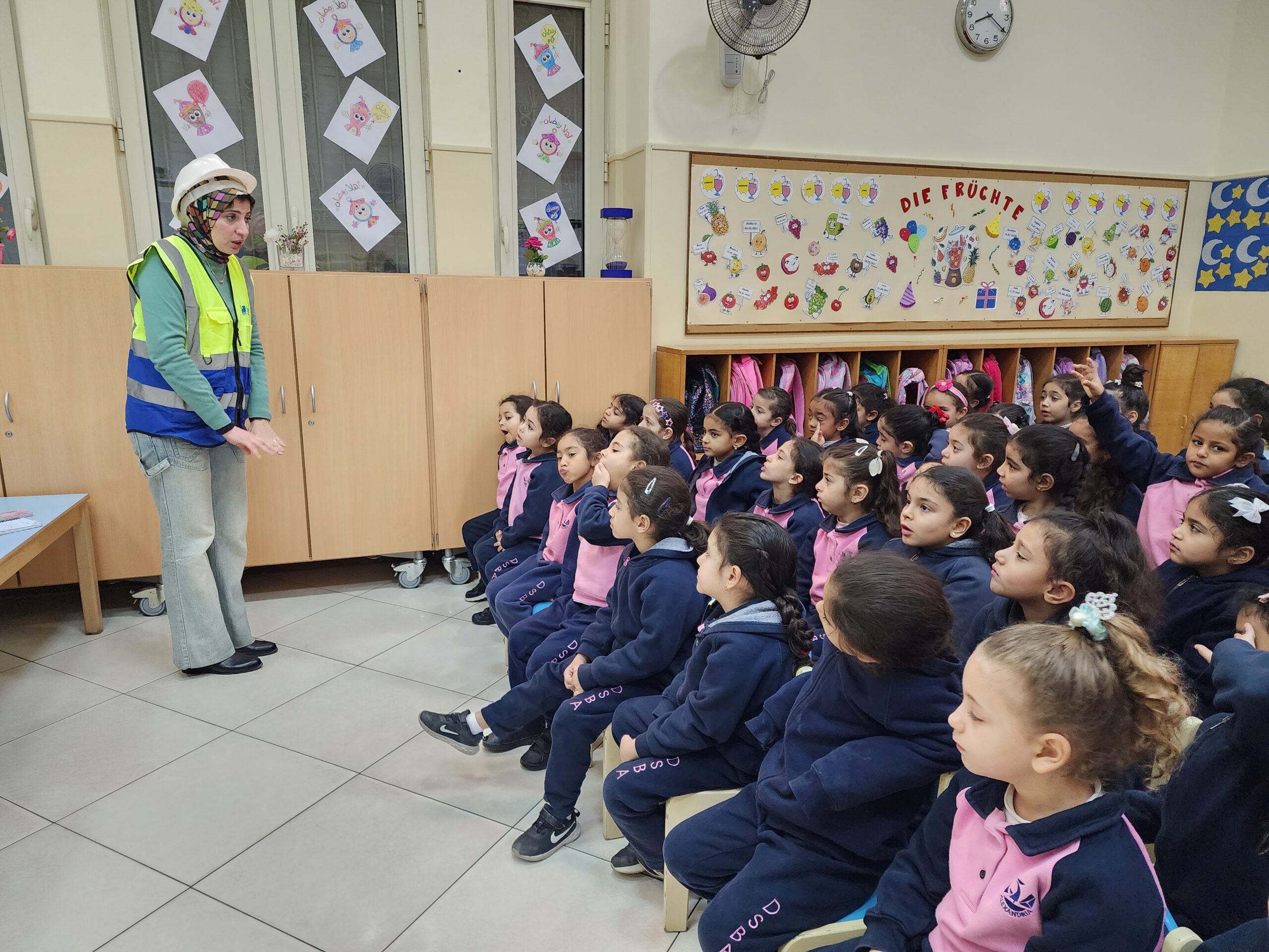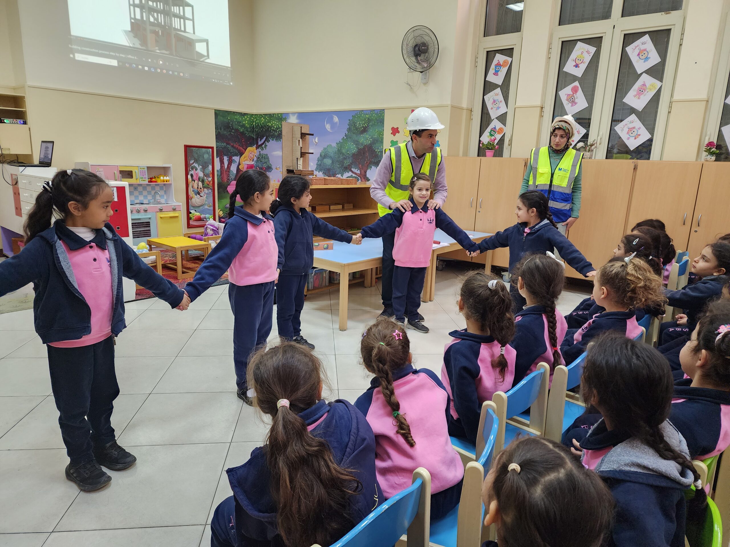Ingenieur Fahd mit Ehefrau präsentierte den beiden Vorschulklassen seinen Beruf. Gut verbildlicht erklärte er wie Schritt für Schritt ein Gebäude entsteht. Zuerst die Baupläne, sowie die technischen Abläufe der Konstruktion. Hierbei müssen nicht nur Gas- und Stromleitungen geplant und gelegt werden, sondern auch Sanitäranlageninstallationen Hand in Hand mit Handwerkern errichtet werden. Den Kindern wurde auch gut verständlich erklärt, warum das Fundament des Bauwerks und die Säulenkonstruktion maßgeblich zur Stabilität beitragen.