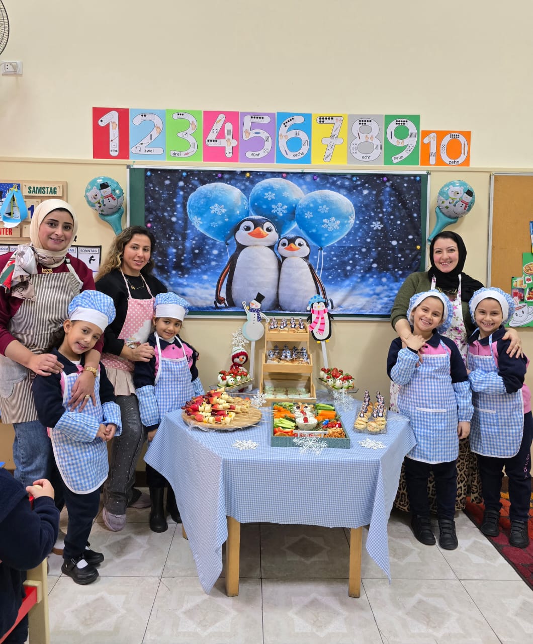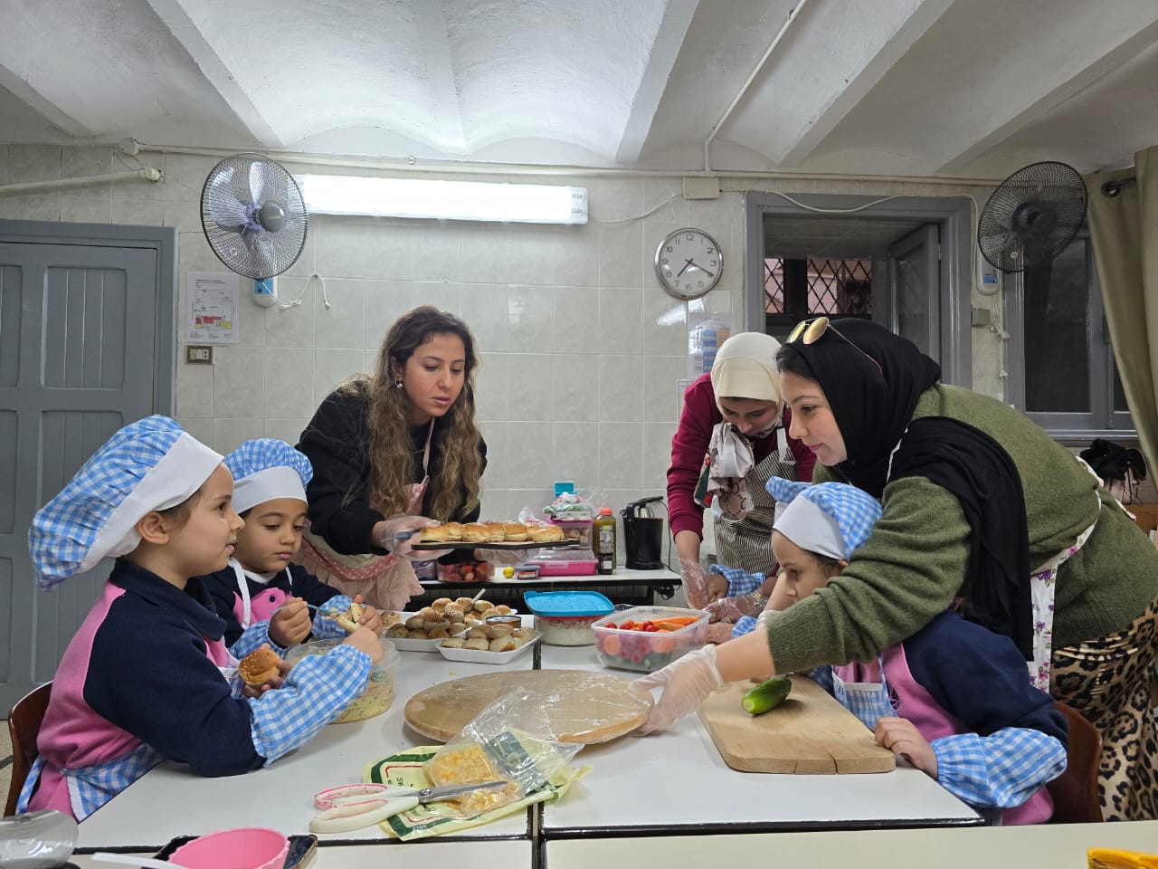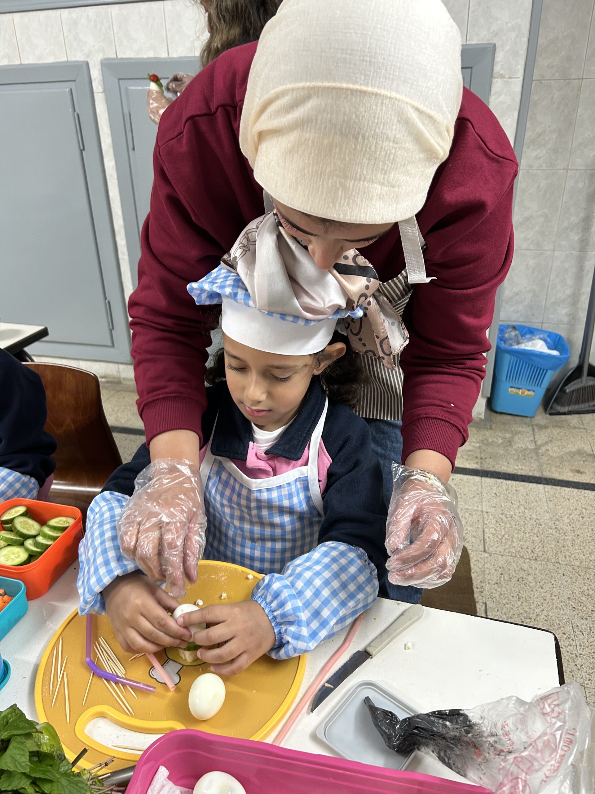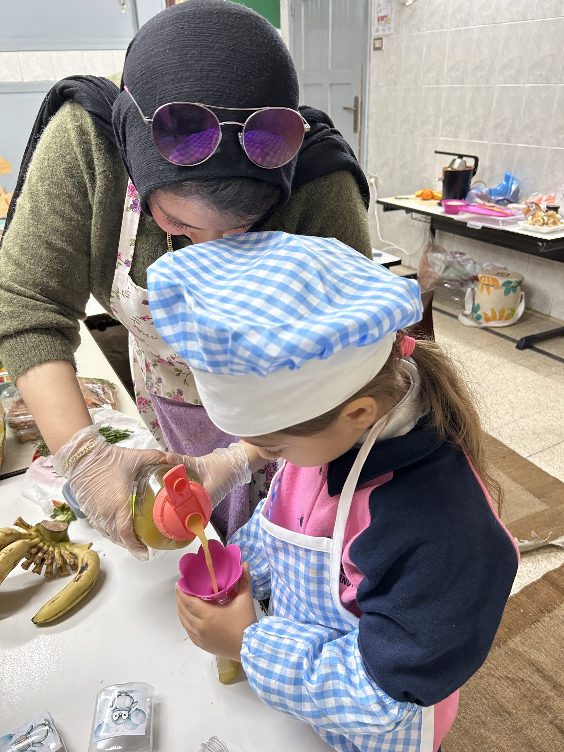 Unsere Vorschülerinnen Dania, Hania, Dalida und Tia kamen heute in den Genuss, mit den Müttern Fr. Yara, Fr. Yasmine und Fr. Kheloud das Essen zuzubereiten.