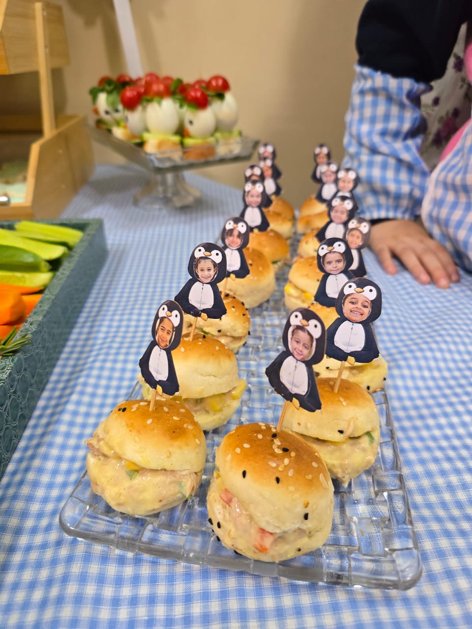 Mit Thunfischpastete bestrichene Minibrötchen trugen jeweils einen aufgesteckten Pinguin. Zudem wurde jedes dieser Pinguingesichter mit Fotos unserer Kinder versehen!