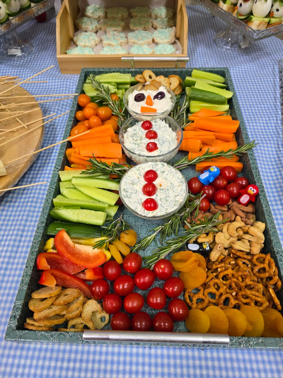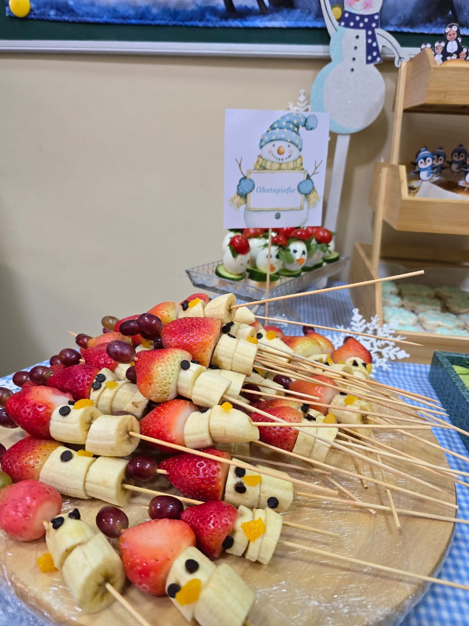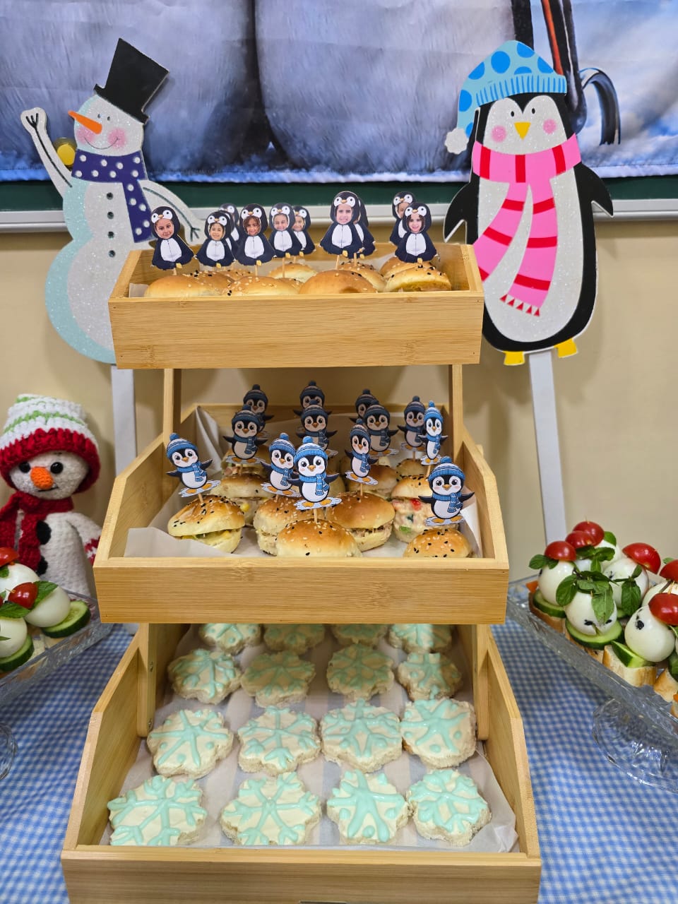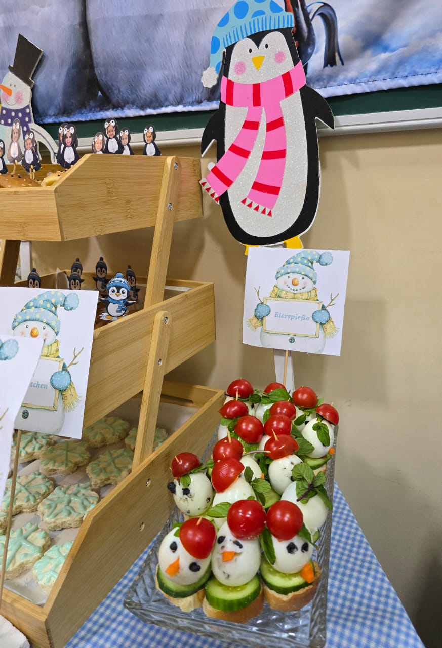 Das Buffet und die sich dahinter befindende Tafel wurden winterlich dekoriert; Pinguine und Schneeflocken durften hierbei nicht fehlen.